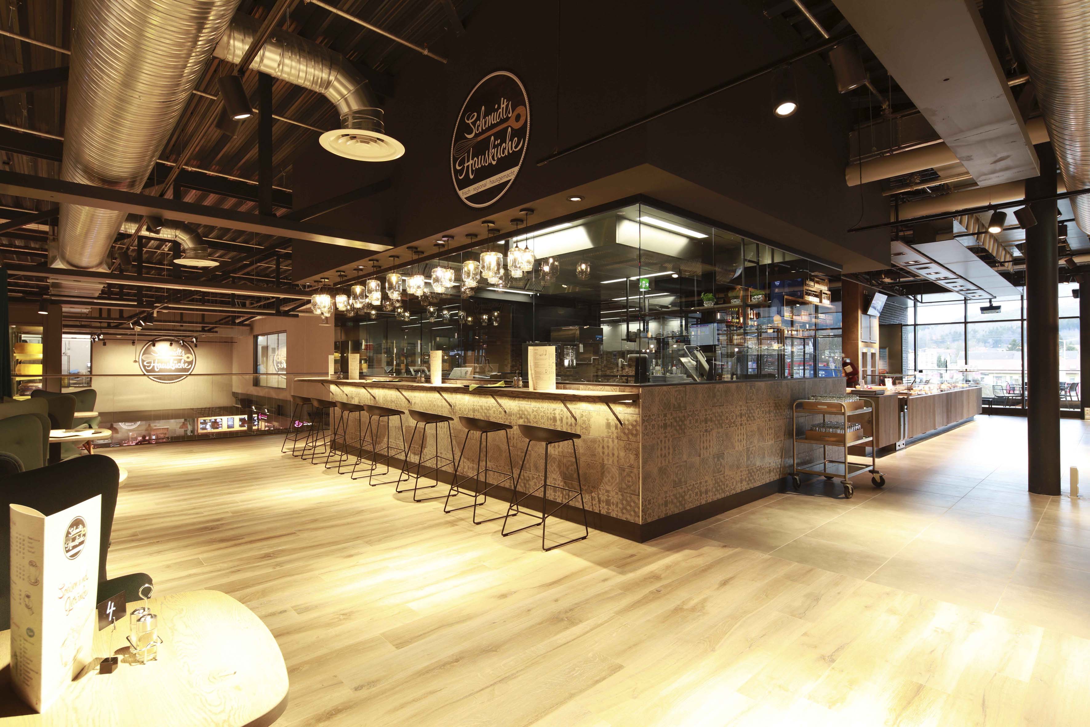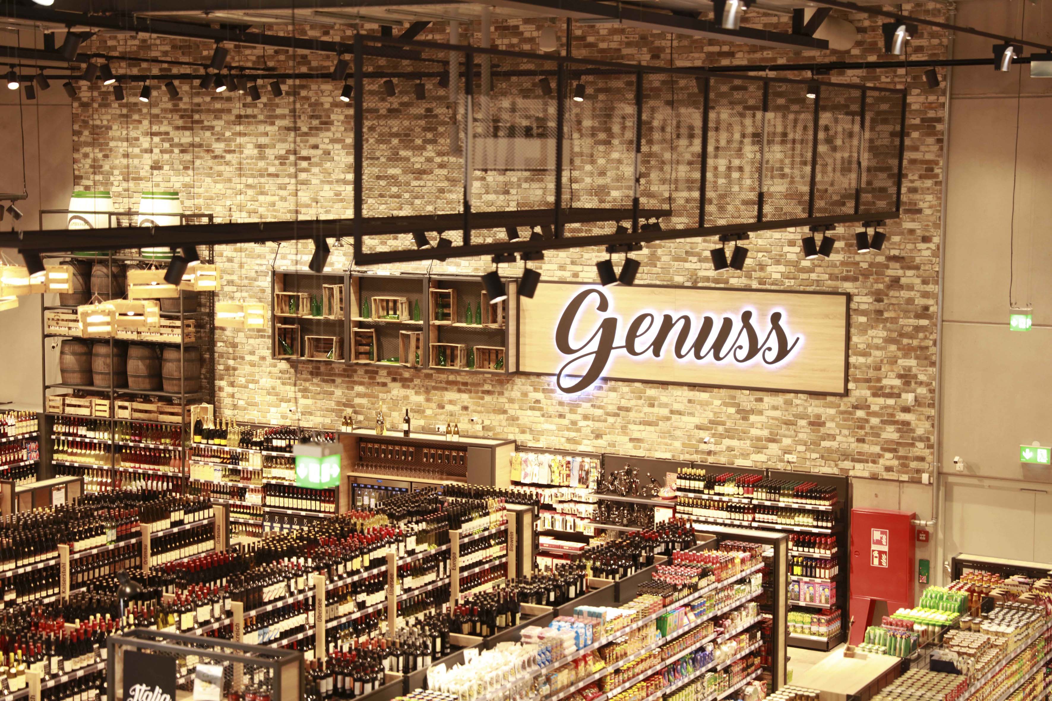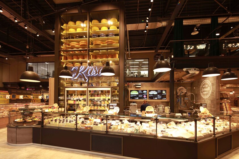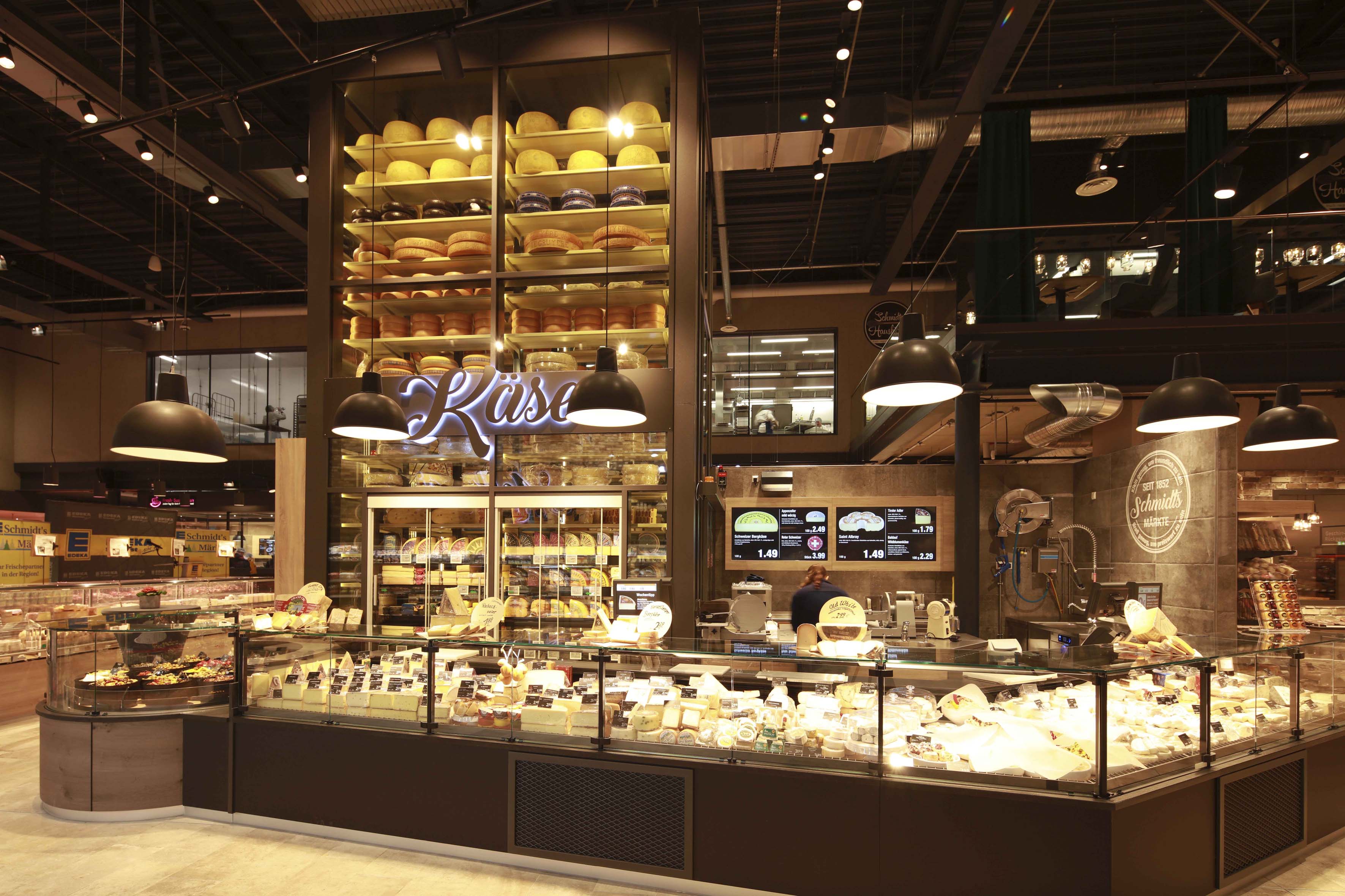 Také zdrženlivý a pro požadovaný dojem jedinečný systém prezentace zboží PURETECH® od společnosti Wanzl s novými gondolovými průčelími zajišťuje pro impozantní sortiment vín mimo jiné požadovanou pozornost. Systém PURETECH®, který byl poprvé představen na veletrhu EuroShop 2017 a získal ocenění „German Design Award 2018“, ponechává prostor pro individuální prezentaci produktů. Ať už se jedná o připínací bodové osvětlení plnící funkci světelného zvýraznění, moderní tabuli pro informace o zboží nebo možnost postranního označení sortimentu – zákazníkovi se díky moderním prvkům působícím na jeho emoce dostane příjemných pobídek k nákupu. Pomocí systému VITABLE® docílíte v oddělení ovoce a zeleniny zážitku čerstvosti jako na tržišti. Tento design se zároveň setkává s dovednou kombinací nostalgického tržního stánku a vzrušujícího, velmi frekventovaného velkoobchodu. Dalším zlatým hřebem je sýrová věž: Lahůdky se tyčí na několika úrovních. Kvůli realizaci dodatečných prvků byla rozmanitá standardní paleta produktů společnosti Wanzl doplněna o speciální konstrukční díly. Například útulný salonek umožňuje zákazníkům nahlédnout do galerie skleněné ruční výroby společnosti Schmidt. Návštěvníci se v příjemném prostředí mohou vizuálně a kulinářsky přesvědčit o čerstvém zpracování potravin. Z nákupu se tak stane gastronomický zážitek, který vybízí ke zdržení a odpočinku od každodenního hektického života.