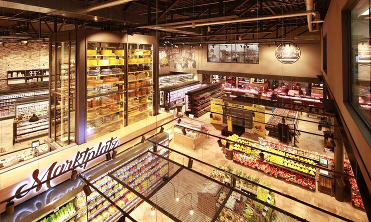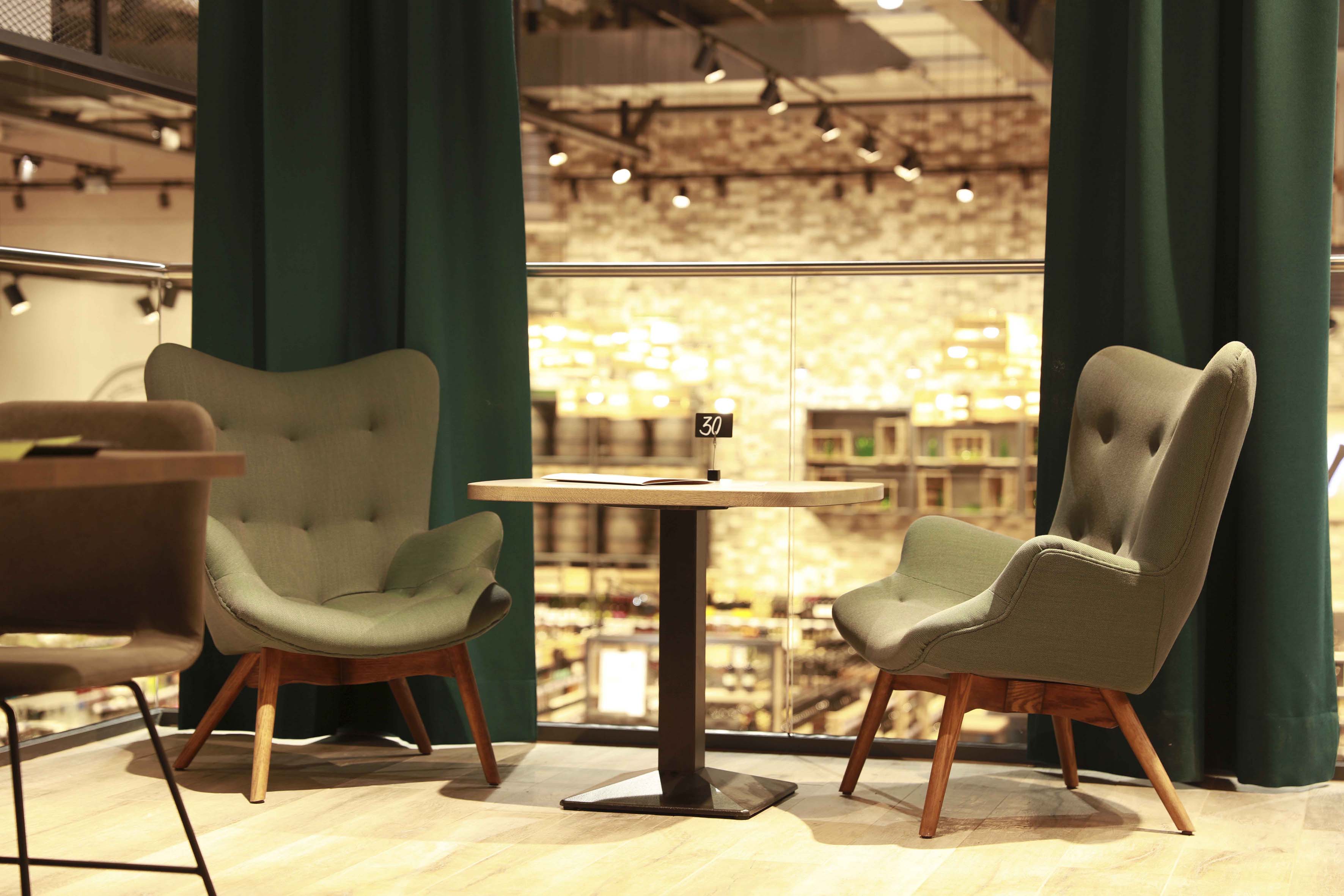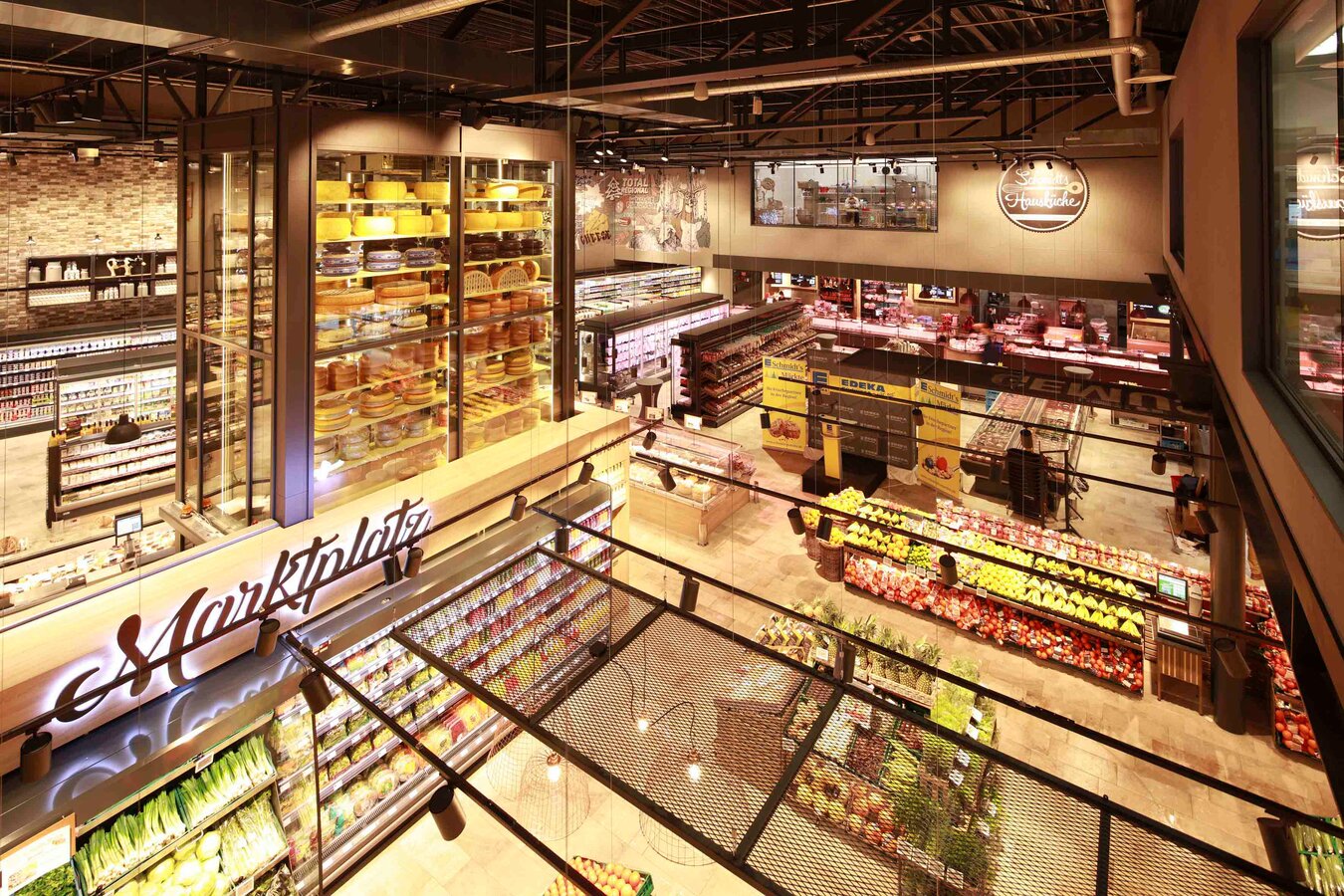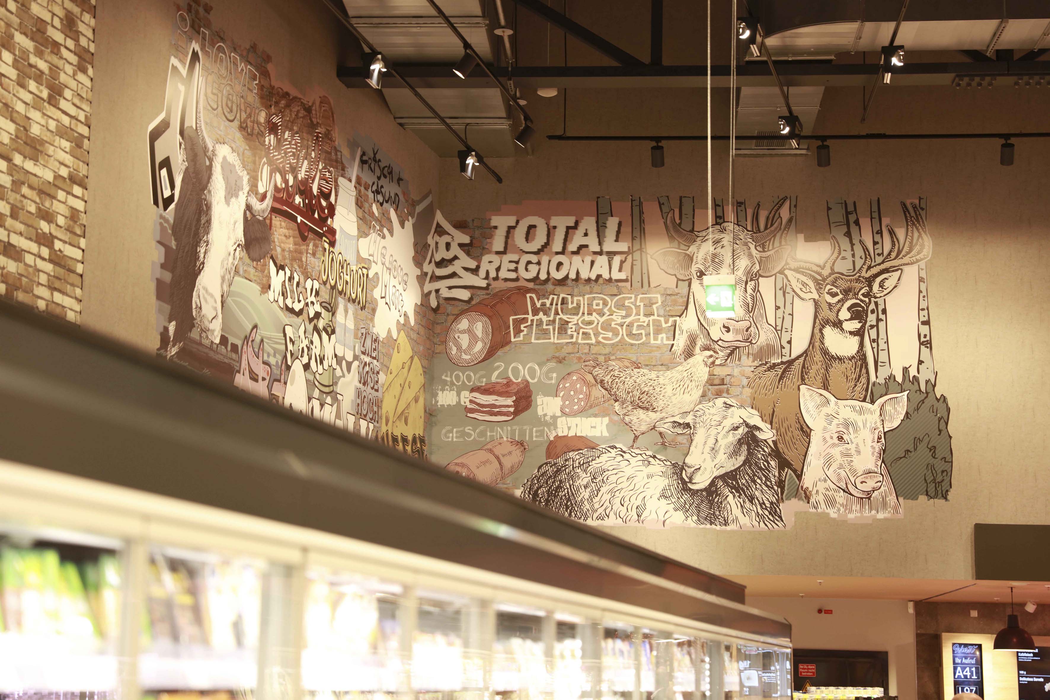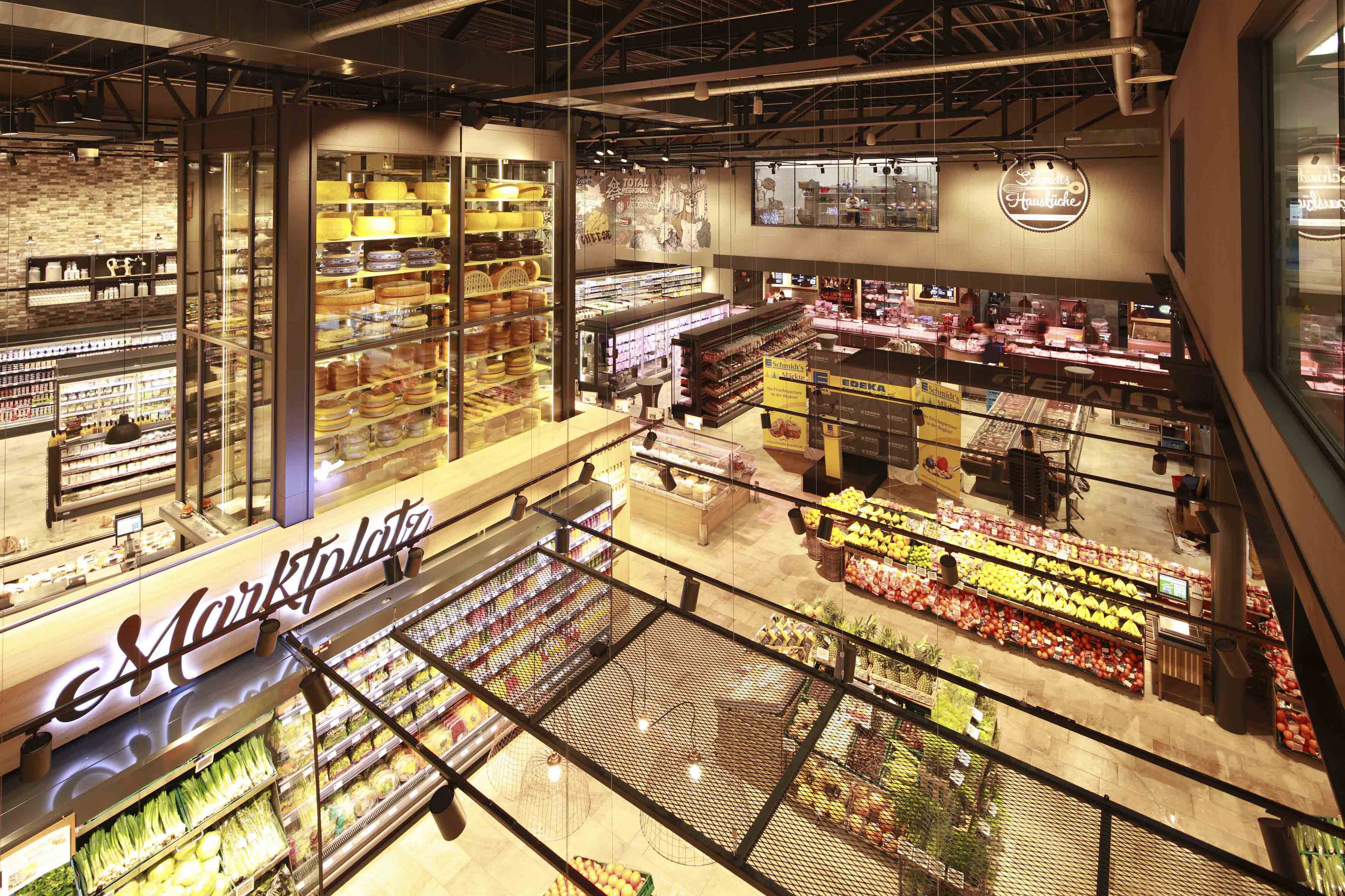Také zdrženlivý a pro požadovaný dojem jedinečný systém prezentace zboží PURETECH® od společnosti Wanzl s novými gondolovými průčelími zajišťuje pro impozantní sortiment vín mimo jiné požadovanou pozornost. Systém PURETECH®, který byl poprvé představen na veletrhu EuroShop 2017 a získal ocenění „German Design Award 2018“, ponechává prostor pro individuální prezentaci produktů. Ať už se jedná o připínací bodové osvětlení plnící funkci světelného zvýraznění, moderní tabuli pro informace o zboží nebo možnost postranního označení sortimentu – zákazníkovi se díky moderním prvkům působícím na jeho emoce dostane příjemných pobídek k nákupu. Pomocí systému VITABLE® docílíte v oddělení ovoce a zeleniny zážitku čerstvosti jako na tržišti. Tento design se zároveň setkává s dovednou kombinací nostalgického tržního stánku a vzrušujícího, velmi frekventovaného velkoobchodu. Dalším zlatým hřebem je sýrová věž: Lahůdky se tyčí na několika úrovních. Kvůli realizaci dodatečných prvků byla rozmanitá standardní paleta produktů společnosti Wanzl doplněna o speciální konstrukční díly. Například útulný salonek umožňuje zákazníkům nahlédnout do galerie skleněné ruční výroby společnosti Schmidt. Návštěvníci se v příjemném prostředí mohou vizuálně a kulinářsky přesvědčit o čerstvém zpracování potravin. Z nákupu se tak stane gastronomický zážitek, který vybízí ke zdržení a odpočinku od každodenního hektického života.