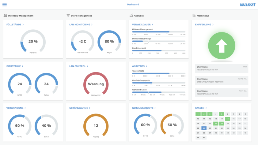 S modulem Store Manager lze shromažďovat všechna data o jedné prodejně na jediné platformě. Je to softwarová informační, komunikační a řídicí centrála pro vedoucího prodejny budoucnosti. V prodejně se vytváří řada dat o různých součástech zařízení. To platí jak pro produkty Wanzl, například nákupní vozíky nebo vstupní systémy, tak i pro zařízení a systémy různých dalších výrobců, jako je ovládání světel, chladicí a mrazicí boxy či stroje na vratné obaly. Tato data se ukládají na cloudu Wanzl a na chytrém zařízení (smartphonu, tabletu atd.) je lze monitorovat v reálném čase. Tímto způsobem lze řídit produkty, zobrazovat výstrahy a analyzovat data ve standardizovaných nebo volitelných systémech reportin