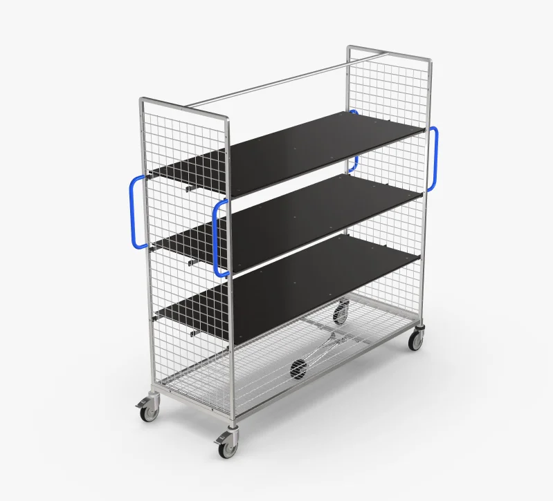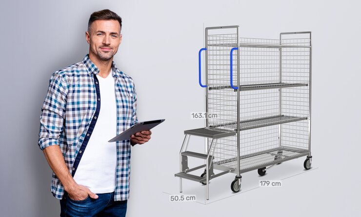 V dalším kroku provede uživatel osazení vozíku policemi. U statických prvků nabízí paleta výrobků spojovací trubky nebo mřížkové police, které se šroubují mezi oba boční díly na horním konci. Dalšími možnostmi jsou police k našroubování nebo mřížková zadní stěna, která navíc zabraňuje proklouznutí zboží. Pokud je vozík naložen více než 50 kg, je pro stabilitu nutný alespoň jeden statický prvek. Pro více úložného prostoru lze k zavěšení přidat další police. Uživatel si zde může vybrat ze čtyř různých možností, které se liší v zahranění (25 mm nebo 100 mm) a materiálu (drátová mříž nebo dřevo). Po vytvoření základního lešení vychystávacího vozíku pokračuje příslušenství. Madlo usnadňuje ovládání vozíku. Rukojeti jsou vyrobeny z ocelových trubek a potaženy plastem. Jsou k dispozici v ultramarínové modré a ohnivě červené barvě. Má-li se vozík na místě otočit o 360 stupňů, měla by se přidat 5. role. Praktická podložka na psaní zavěšená na vnější straně bočního dílu přispívá ke strukturovanému způsobu práce. Má svěrnou lištu a nastavitelný úhel sklonu. Pro bezpečnou přepravu cenných výrobků na vozíku lze v kombinaci s mřížkovou zadní stěnou přidat také uzamykatelné dveře.