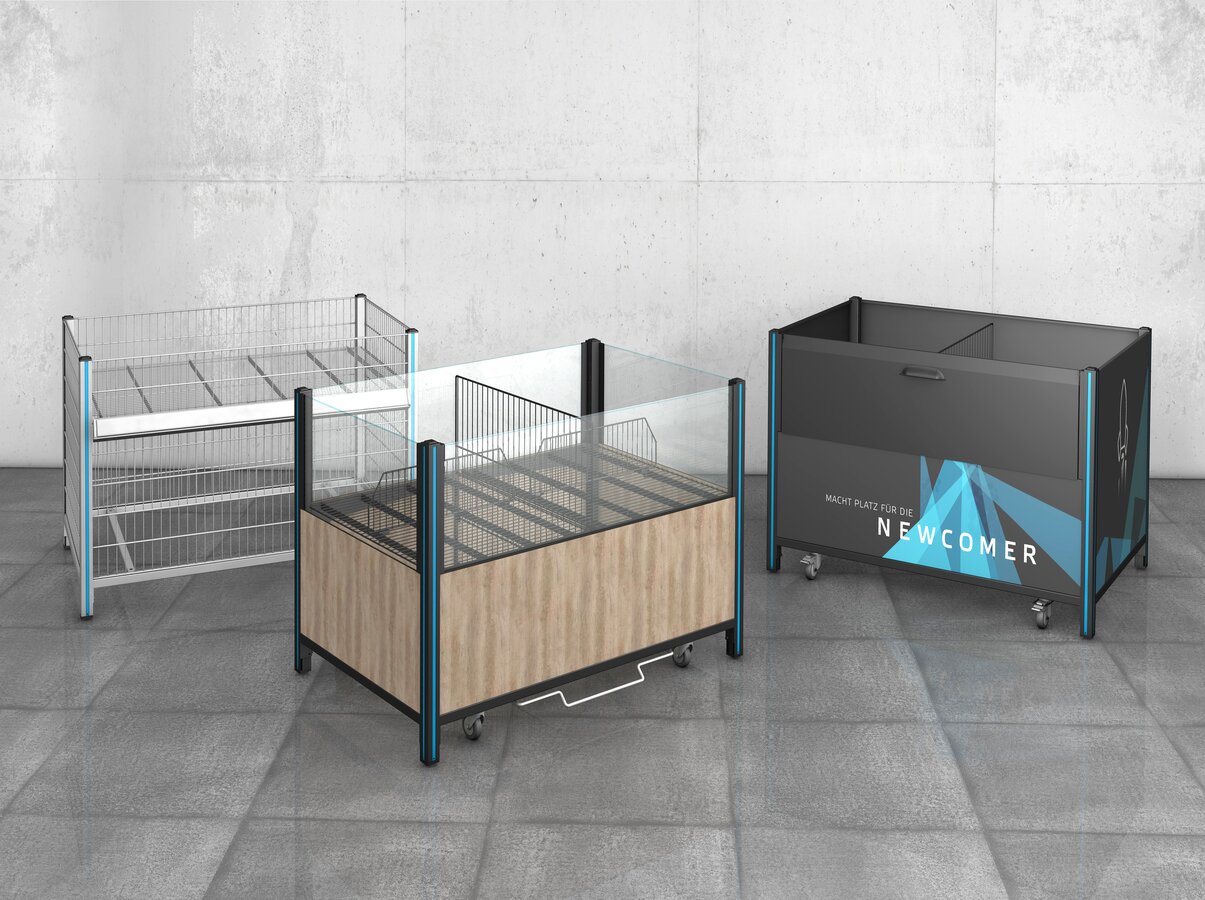Speciálně zhotovené nástavce zvyšují kapacitu stolu FlexTable, a jsou díky tomu ideální pro cross-selling. O pořádek na prodejním stole se starají jedno- nebo dvoudílné podlahové rošty s vysokou nosností.