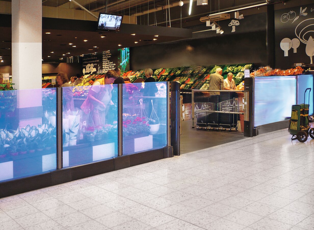 Již ve vstupní oblasti lze aplikovat účinná, ale přitom neodstrašující řešení. Tak zabrání např. vstupní zařízení jako eGate tomu, aby zákazníci mohli prodejnu opět opustit, aniž by museli projít pokladnami. Se standardně vybavenými akustickými poplašnými zařízeními se zpětným chodem poskytuje eGate potřebné zabezpečení. Jelikož toto zařízení zůstane při pokusu o opuštění prodejny přes vstup zavřeno, dokonce i když chce do prodejny zákazník vejít. Na zákazníka působí díky vstupnímu turniketu, který je k dispozici v různých variantách, přesto lákavě. Také atraktivní prostorové dělicí příčky Railix® chrání spolehlivě před krádežemi. Flexibilní plexisklové prvky se uzavírají bez zanechání jakékoli mezery. Drátěná mřížka má rozteč ok pouhých 50 x 50 mm, takže již nelze propašovat žádné zboží ven. Díky průhlednému sklu nevnímá zákazník tento dělicí prvek jako bezpečnostní opatření, ale jako otevřený designový prvek. Provedení Railix® Colour svítí různými barvami s energeticky úspornými LED žárovkami, a přizpůsobí se tak podnikové identitě prodejny. Výsledek: plošně vysoce kvalitní nákupní prostředí.