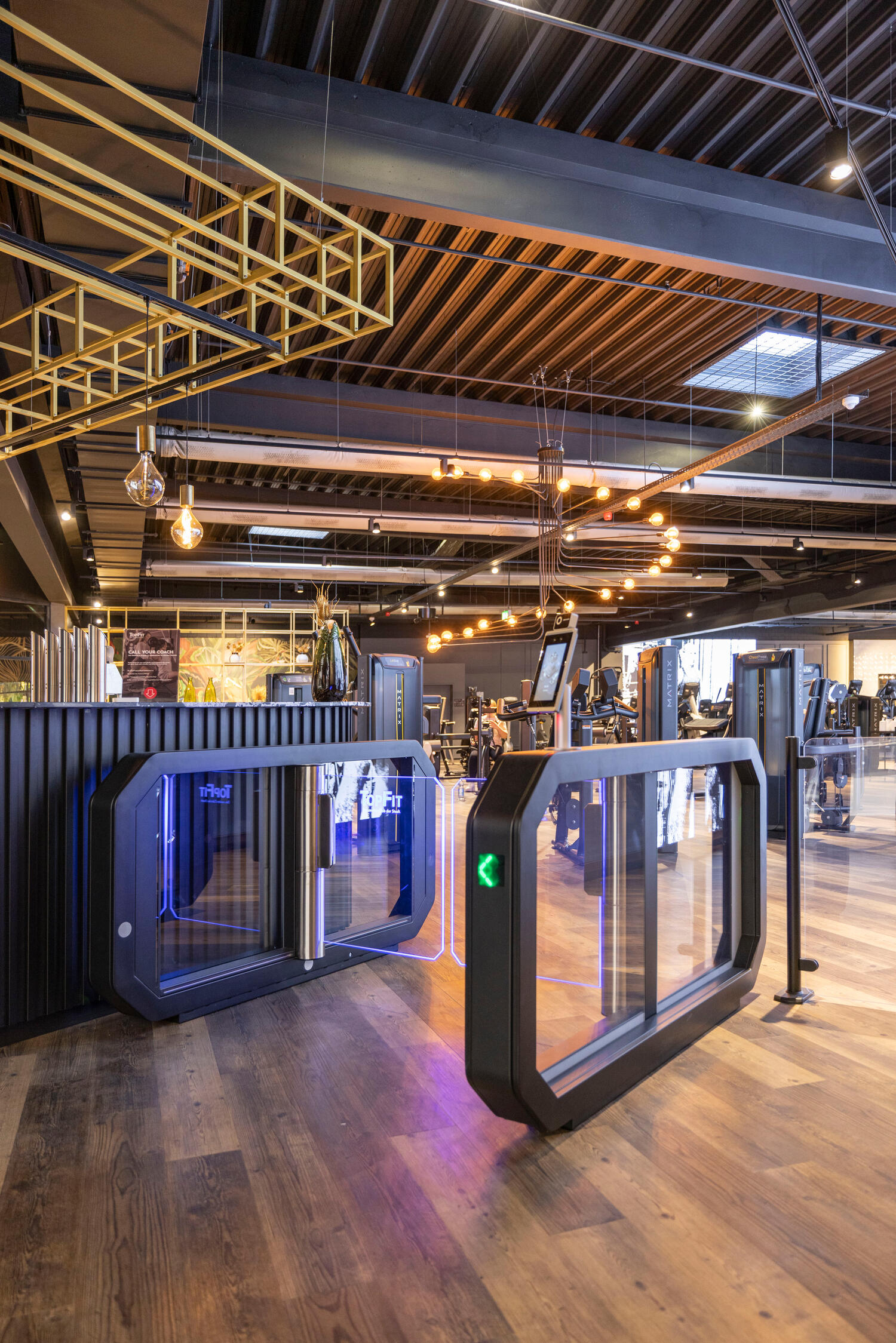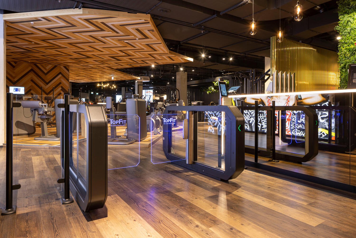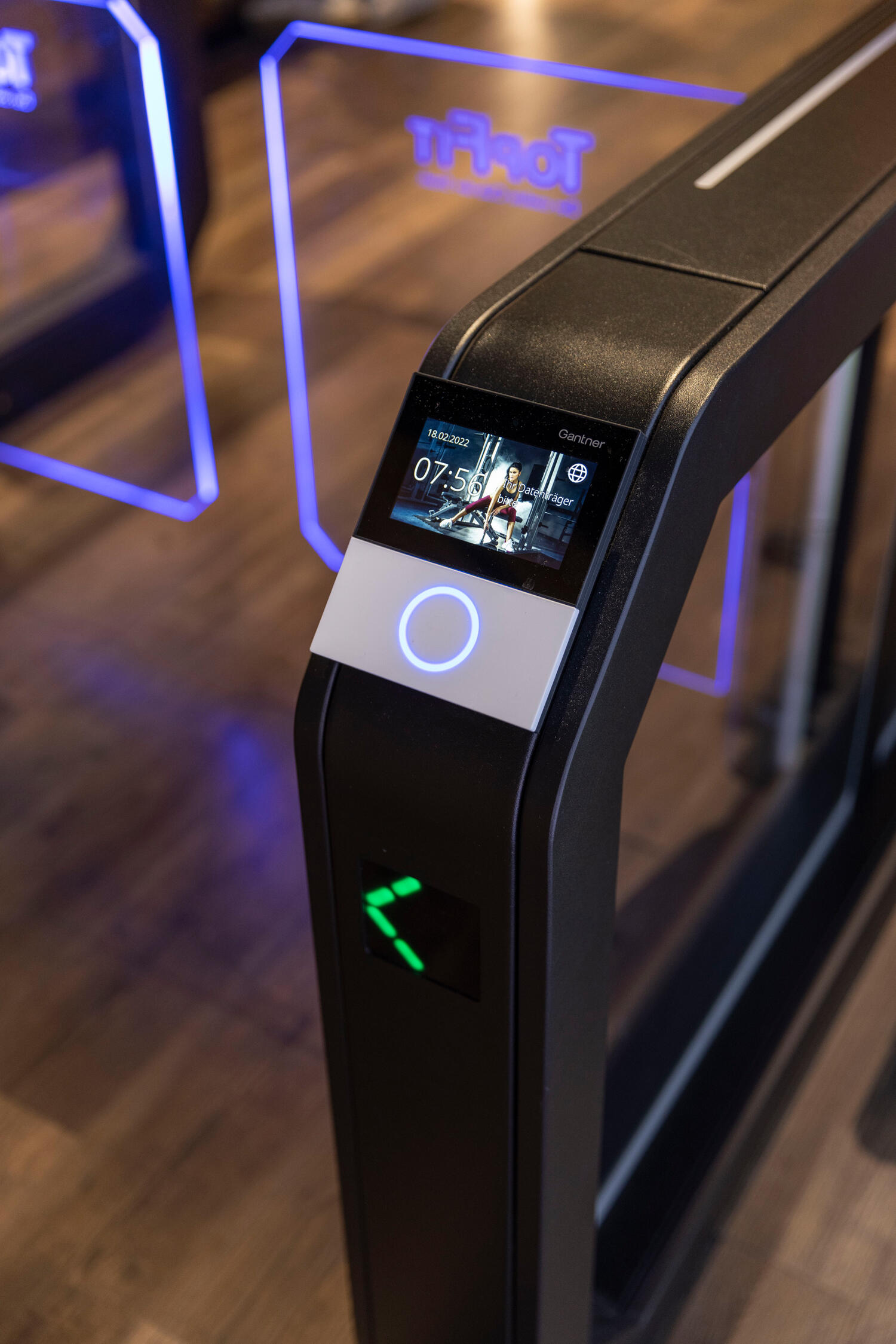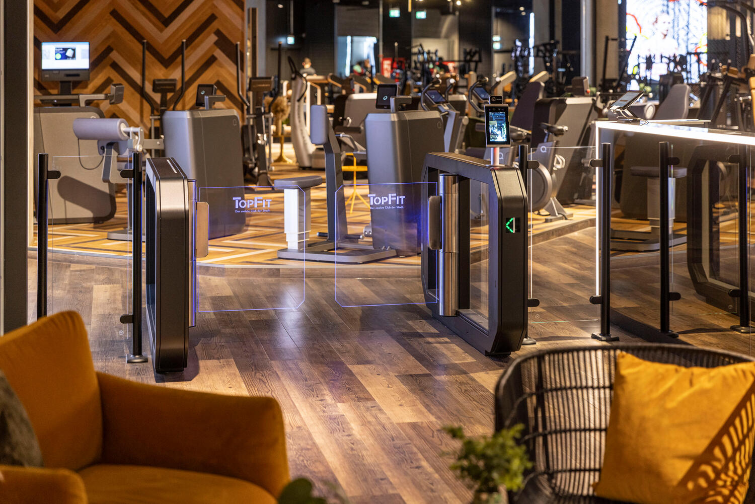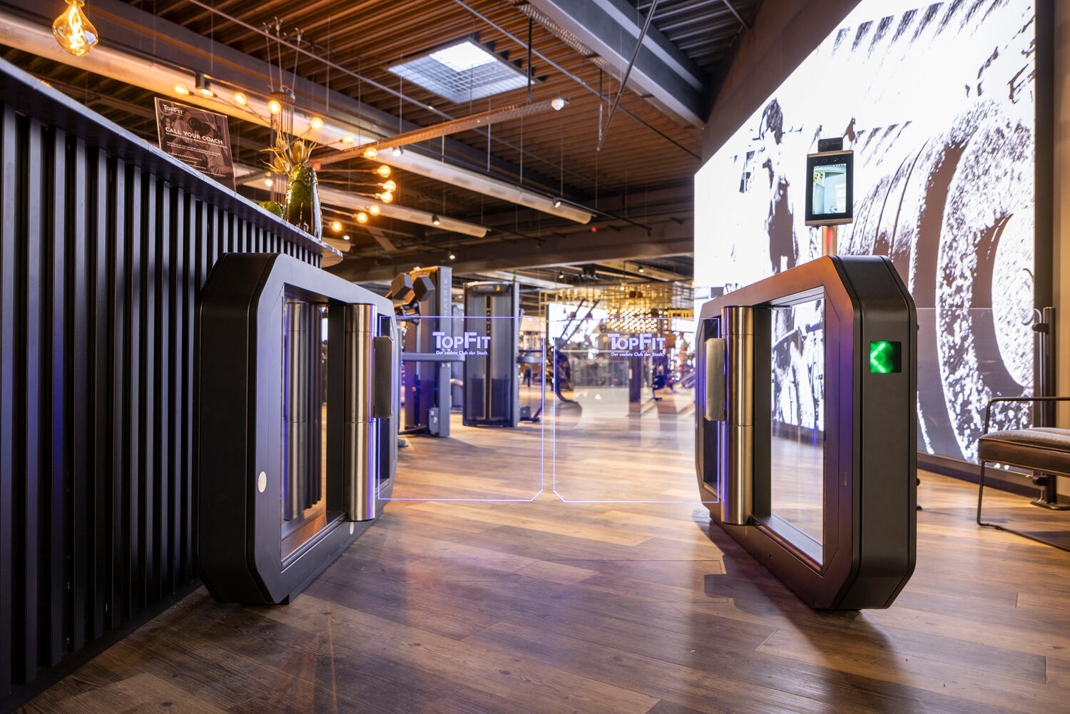 Vysoce kvalitní nerezová ocel s puristickým černým práškovým lakováním, logo studia na výkyvných ramenech z tvrzeného bezpečnostního skla a stylová obrazovka na madle – členové klubů TopFit vědí již při vstupu, že trénují ve speciálním fitness studiu. Elegantní přístupový systém Galaxy Gate 1.1 od specialisty na vstupy Wanzl, který je dokonale přizpůsobený estetickému konceptu studia, upoutá pozornost a díky čtečce RFID, biometrickému rozpoznávání obličeje a nejmodernější senzorové technologii zaručuje maximální komfort při vstupu do mnoha klubů TopFit, mimo jiné v Ulmu, Ellwangenu, Aalenu, Gmündu a Geislingenu.