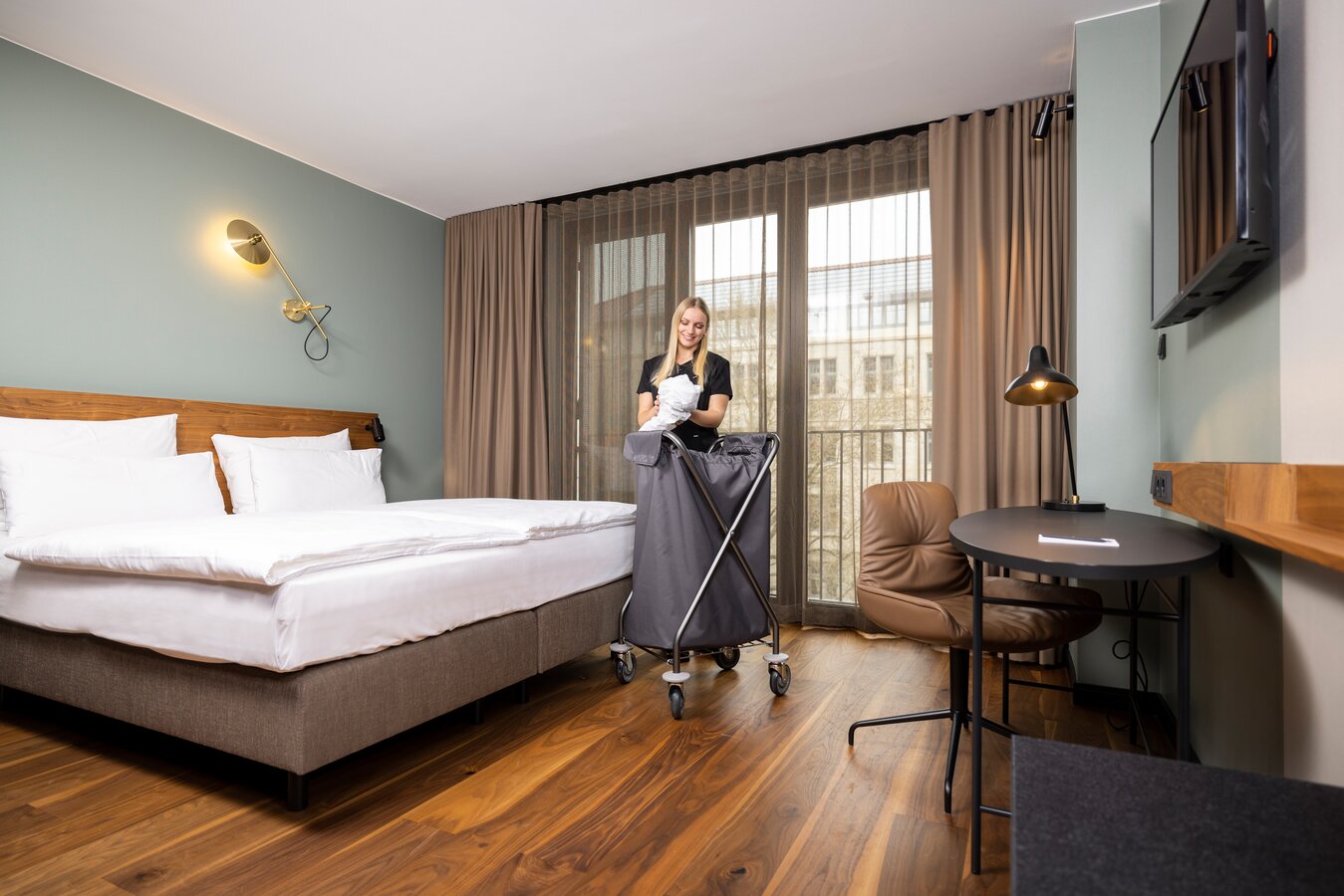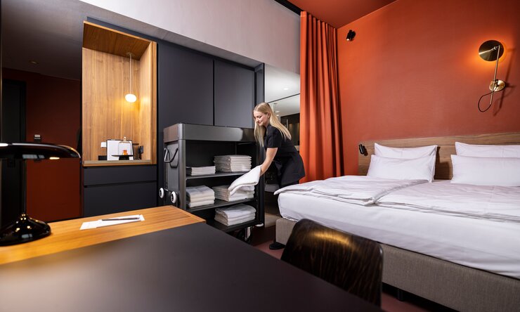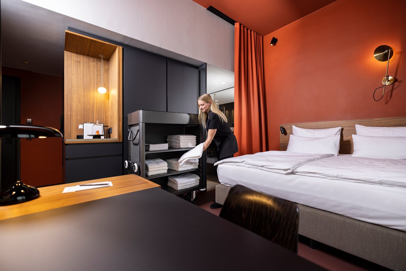 understreger housekeeping-teamet. De seneste måneder har tydeligt vist, hvor afgørende renlighed og hygiejne er for en god, samlet følelse, og hvordan renlighed og hygiejne fortsat er visitkortet for hvert enkelt hotel. "Vores housekeeping-team har kendt produkterne fra Wanzl Hotel Service i otte år, og hvert produkt har sine egne særlige egenskaber og fordele. Vores yndlingsprodukt er stuepigevognen Mundus 9. Ud over at se godt ud og passe perfekt til EmiLus charme overbeviser den med detaljerne i udstyret og dens funktionaliteter. De variabelt indstillelige hylder og sidedele, den generøse plads til hotellinned, guest supplies og rengøringsredskaber, de sammenklappelige bøjler, de ergonomisk afrundede rammer og den solide grundkonstruktion af stål. Vores personlige favorit er Wanzls typiske, ekstra afviserruller, som beskytter vores førsteklasses design-inventar på enestående vis. Apropos hjul – det femte hjul til bedre manøvrering og andre udstyrsopgraderinger såsom flere stødprofiler, farvevarianter, ekstra affaldssorteringsbokse, aflåselige push & pull-skuffer og gardiner er en stor hjælp i det daglige housekeeping-arbejde med en højkvalitetsvogn som Mundus fra Wanzl. Der er ingen tvivl om, at Wanzl Hotel Service-produkterne er yderst populære i branchen på grund af de omhyggeligt gennemtænkte funktioner, den nemme håndtering og det pålidelige udstyr."