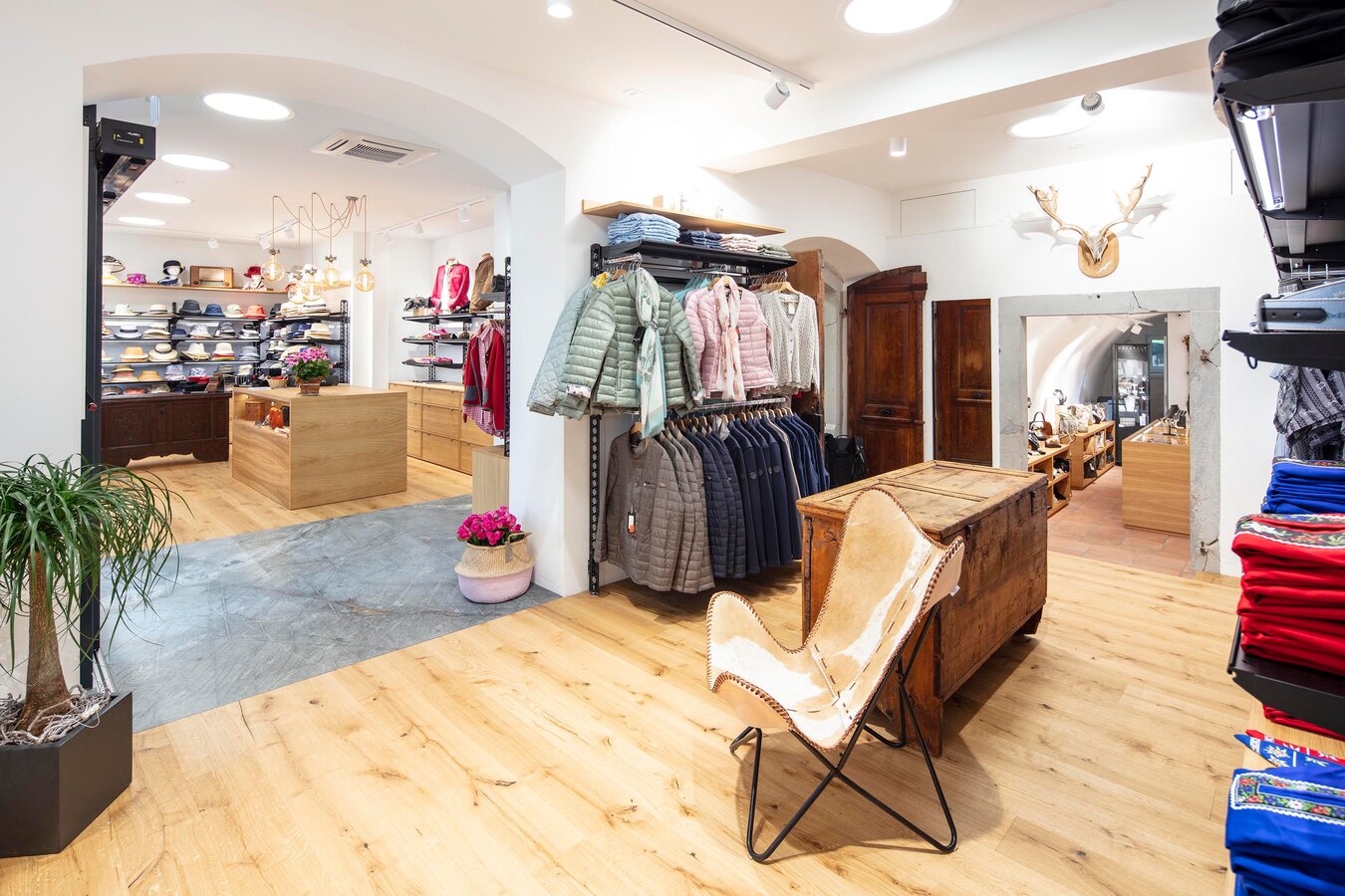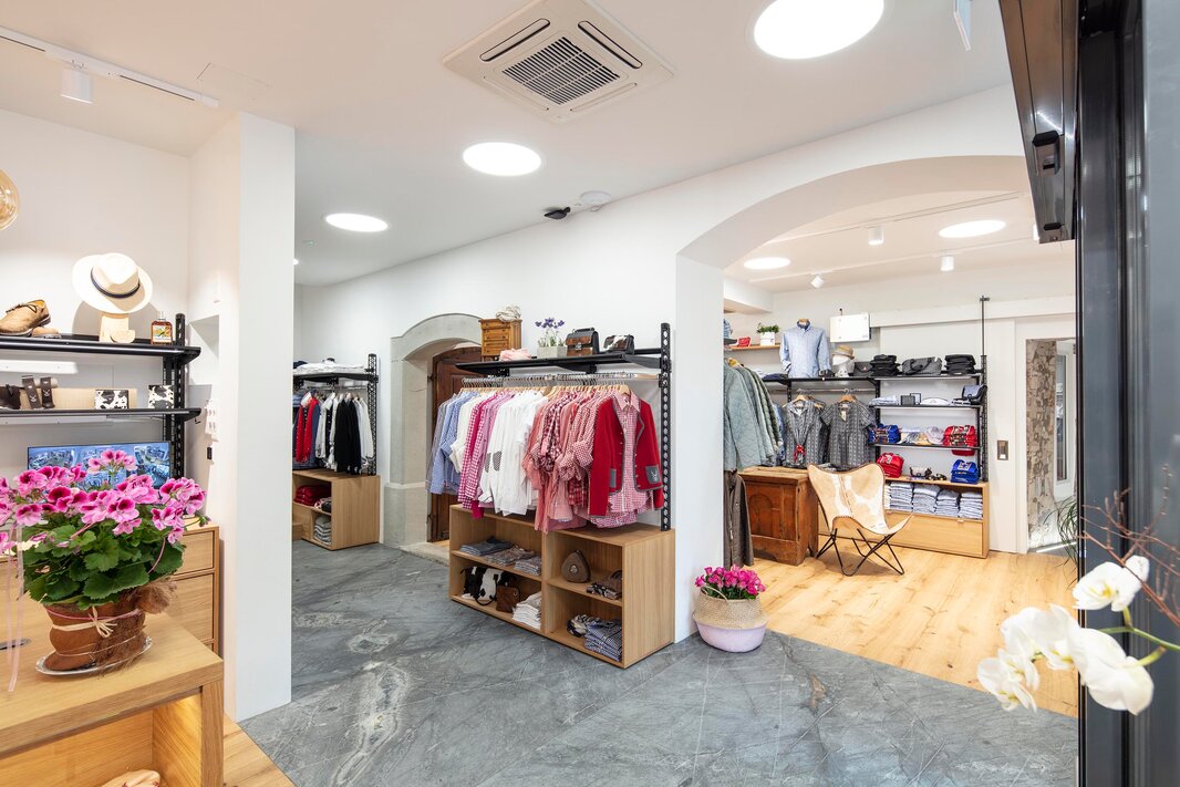 De enkelte salgslokaler er individuelt indrettet og fyldt med kærlige detaljer. Olierede egetræsbrædder, lagt skiftevist med et flisegulv i sandsten, skaber en utrolig følelse af velvære. Store, gamle hængslede døre, smukke antikviteter eller læderstole fra Alperne og dekorative elementer skaber en atmosfære med et koordineret look. Det er legende let at være tæt på kunden og yde personlig rådgivning i et passende miljø.