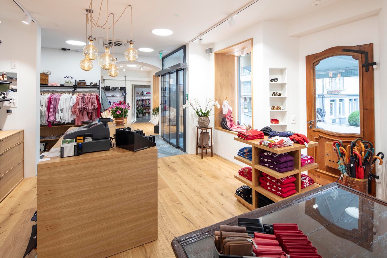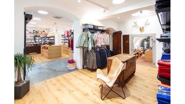 Mode i landlig stil, traditionelle klædedragter og masser af charmerende accessories præsenteres på forskellige egetræsmøbler. De sorte wire tech-reoler står i den forbindelse direkte på træmøblet uden fødder. Særligt iøjnefaldende er belysningen over kasseområdet, der består af fem kuglependellamper med tre sølvfarvede oksehoveder.