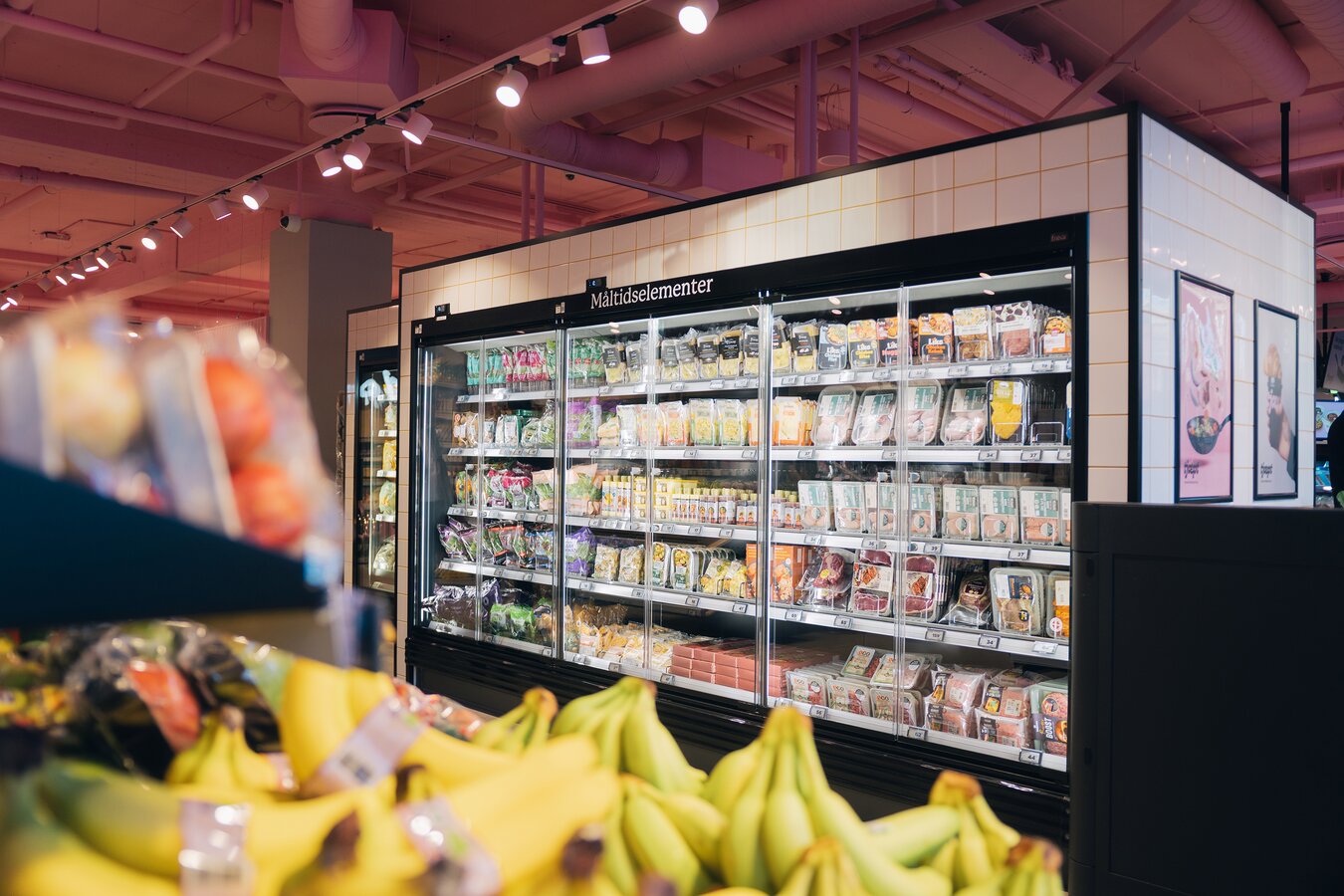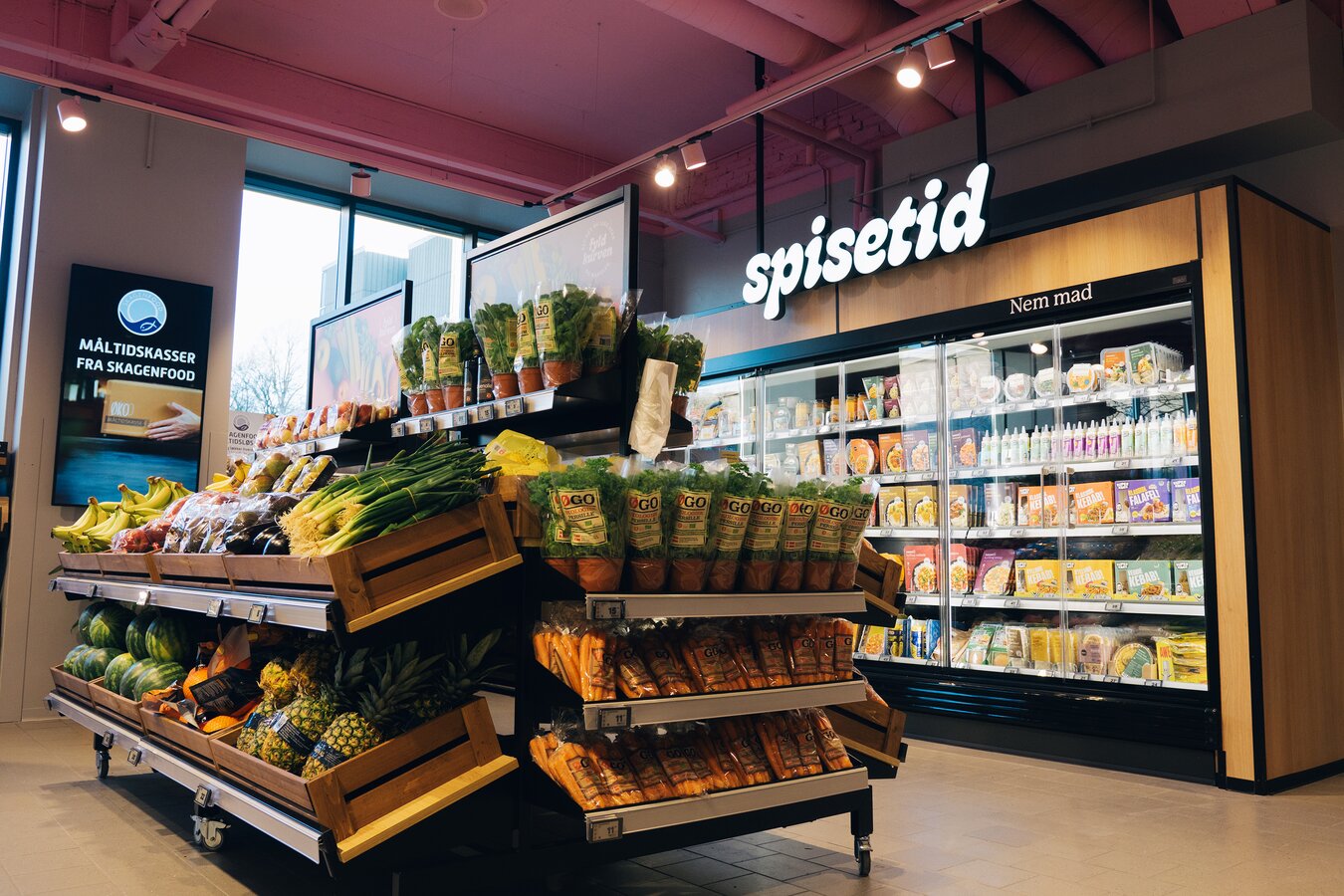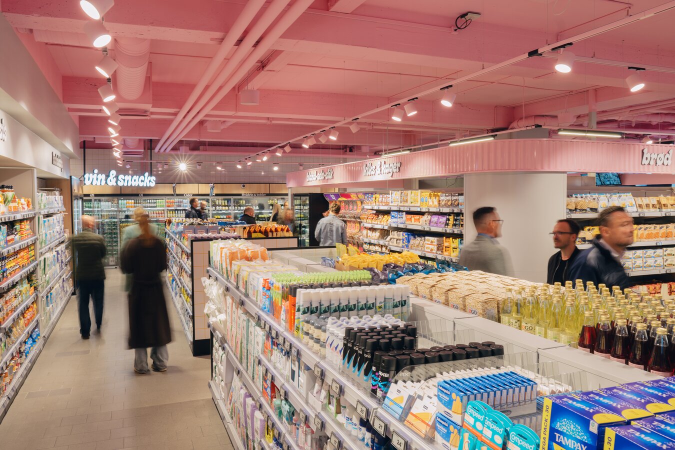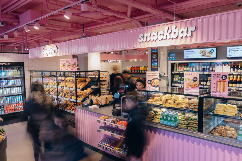 Derfor er butikken blandt andet indrettet med forskellige flows alt efter, hvor meget du skal købe. Allerede ved indgangen møder du convenience-afdelingen, hvor du hurtigt kan vælge, scanne og betale – og være videre. Skal du have dagligvarer, fortsætter du længere ind i butikken.
