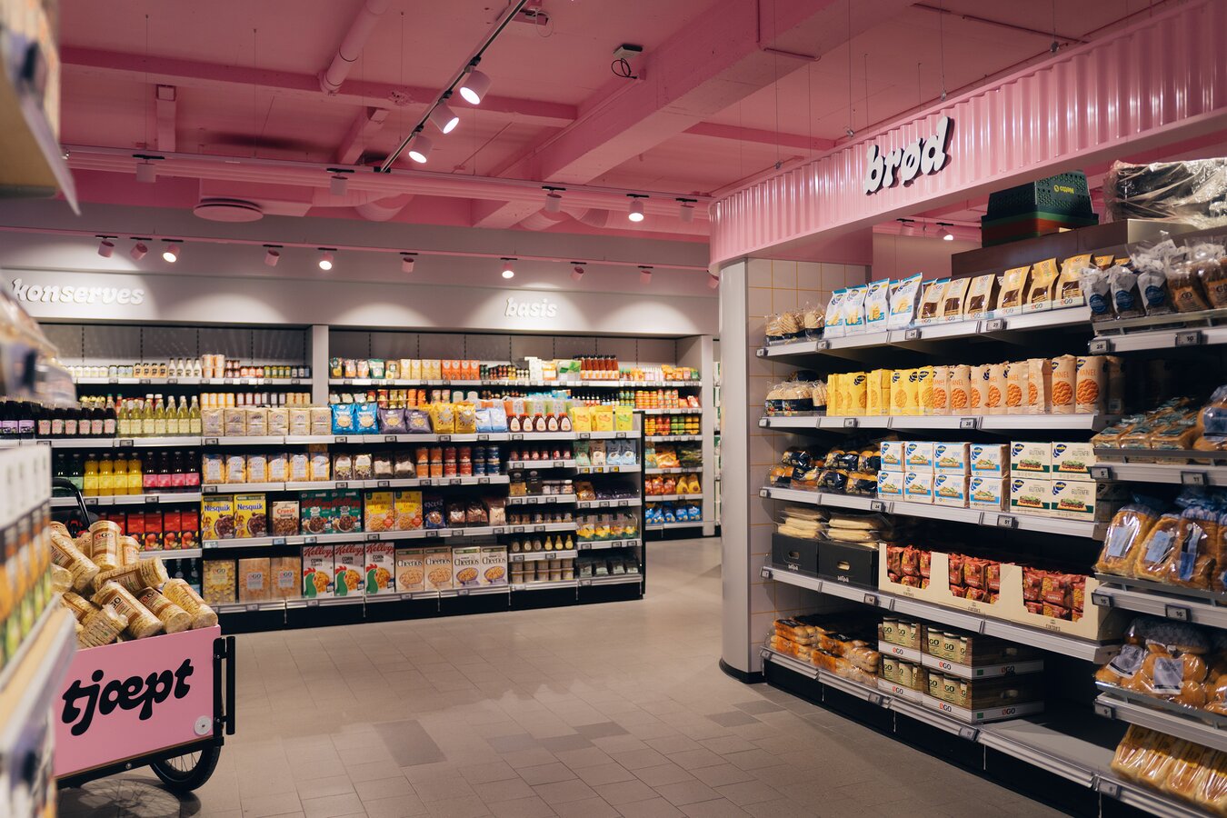 Inventarkonceptet kombinerer Nettos eksisterende reoler med nye løsninger udviklet specifikt til Tjæpt, som bærer konceptet og får butikken til at skille sig ud.
