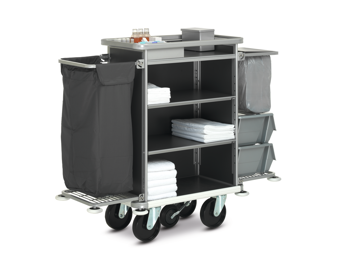 Rengøringspersonalet kommer let rundt med vognene. De specielle hjul gør det meget nemt at køre og vende vognen, også på tæpper. Afstandsruller forhindrer eventuelle beskadigelser, f.eks. af væggene. Den fleksible konfiguration giver stor designfrihed, afstemt efter individuelle ønsker, hvad enten det drejer sig om farve, materiale eller udstyr.