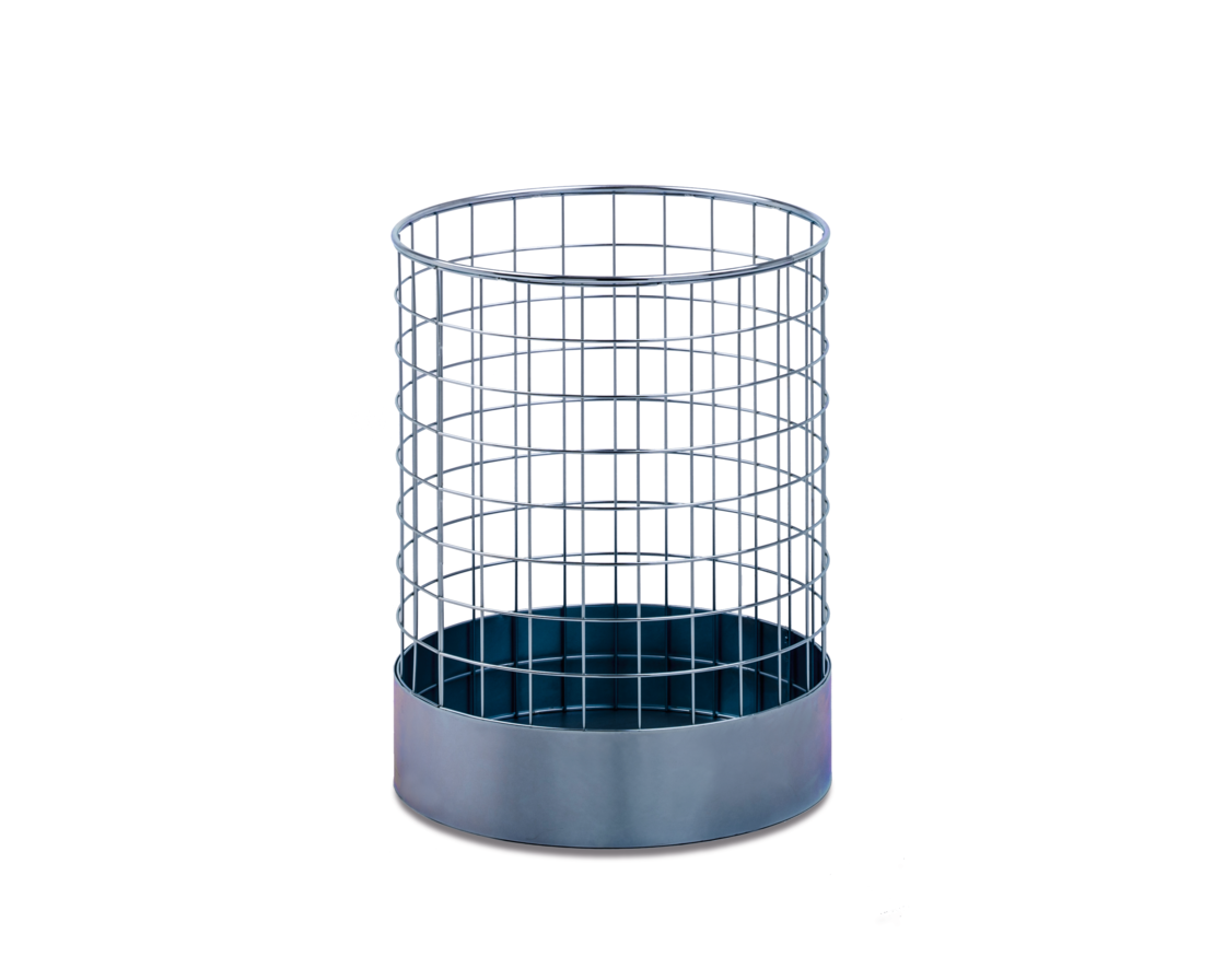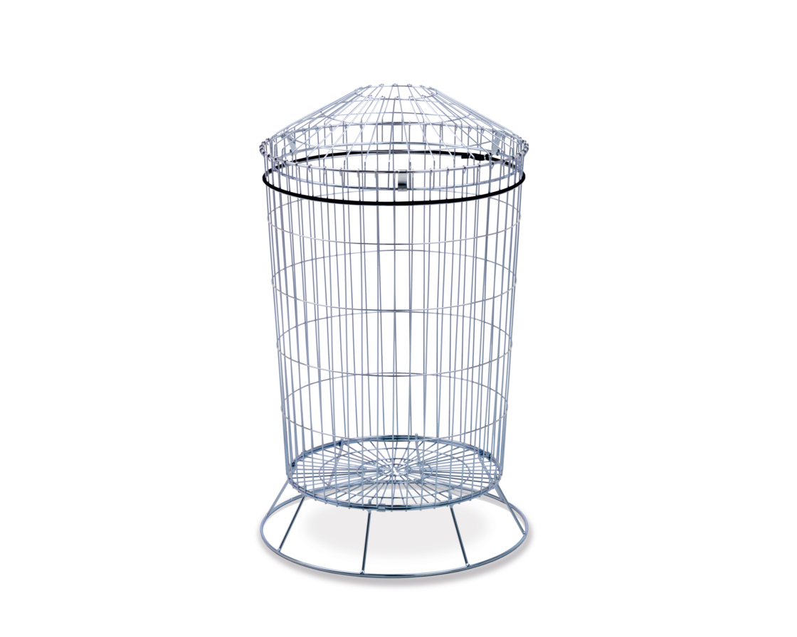 Ståltrådskonstruktion med metalkappe, 50 x 50 mm maskevidde. For at lette rengøringen er der et lille hul i bundpladen, så der kan løbe væske ud.