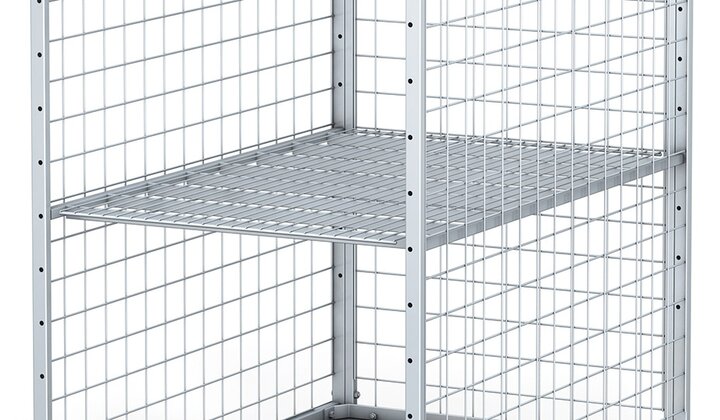Stel af stabilt firkantrør med trådgitter. Opbygning med fastskruning. 1 side åben: kort eller lang side. Hylder til fastskruning som ekstraudstyr. Leveres uden træpalle.