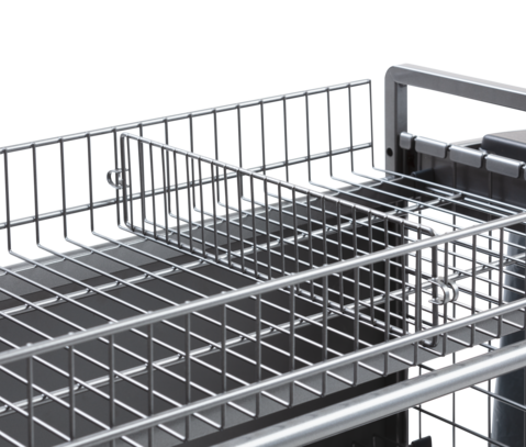 Modellen overbeviser ved ikke at bruge nogen plastdele. Det gør den mere robust og hygiejnisk. Bagvæggen er fremstillet af slidstærkt, stødsikkert træ. Den fungerer også som afskærmning og smudsbeskyttelse og kan ved behov eftermonteres ligesom sidedelene og trådhylderne. Det vil sige, dens lange levetid gør den yderst prisgunstig.