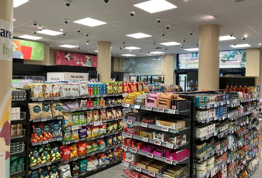 Når du er færdig med at vælge dine varer, kan du blot forlade butikken. Kameraer i loftet med avanceret kamerateknologi, udviklet af den amerikanske techvirksomhed AiFi, har nemlig automatisk registreret det, du har lagt i indkøbsposen.
