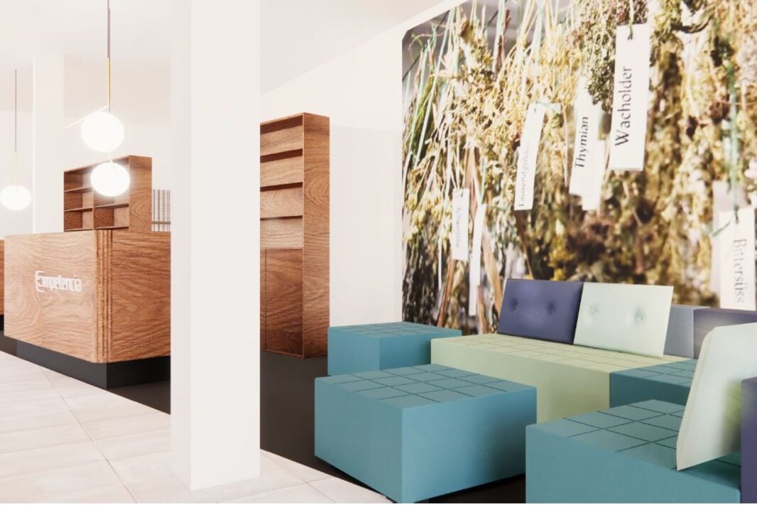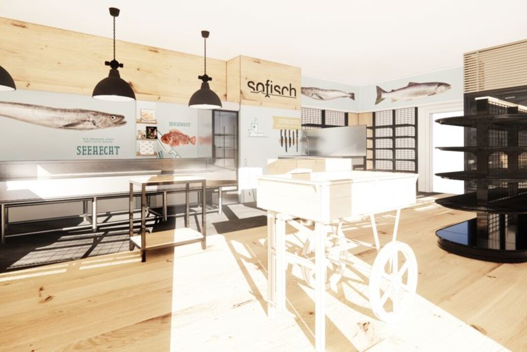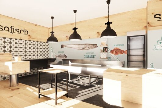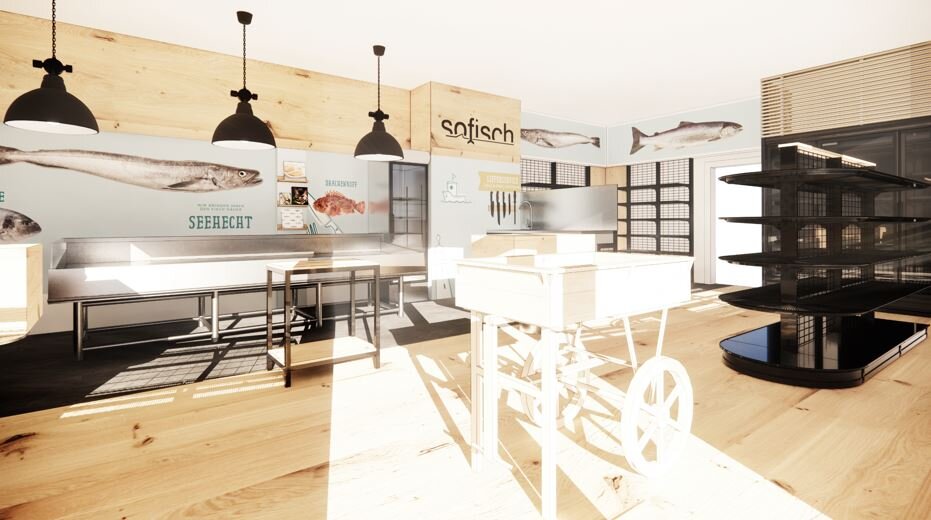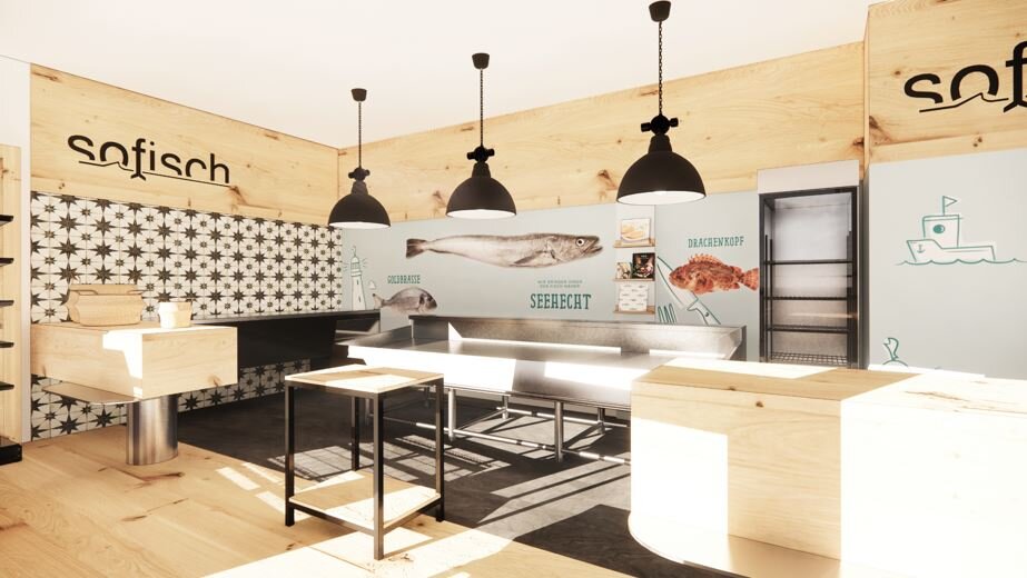 Für eine warme und einladende Stimmung sorgen hier Materialien wie Dekor in Esche, Sandbeige, Blauton in Anlehnung an das bestehende Logo und Zementfliesen, die den Charakter eines Fischladens zusätzlich unterstützen.