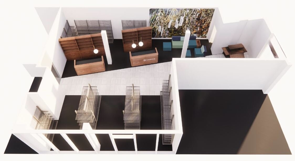 Durch Holz-Akzente, gepulverte Formrohrkonstruktionen, Zementfliesen und vereinzelten Farbelementen verbindet sich der Verkaufsraum optimal mit dem Bistro.