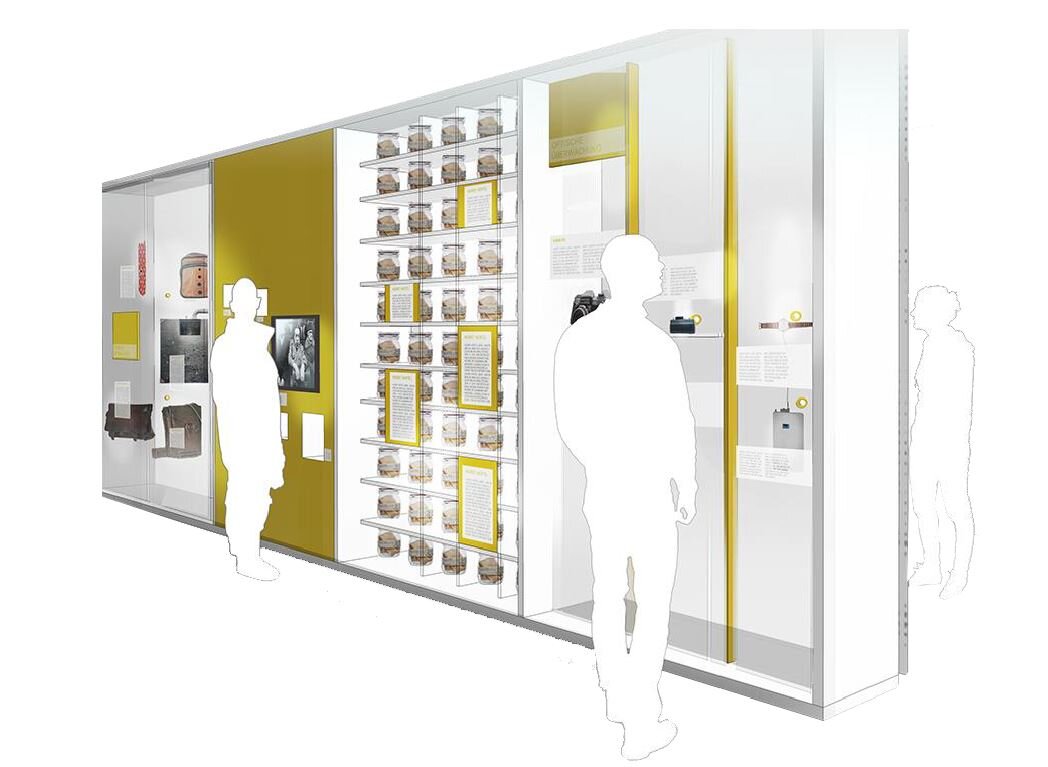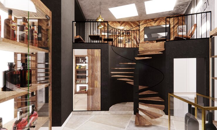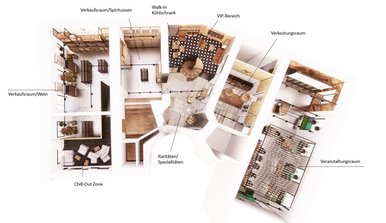 Gewölbe und hohe Raumhöhen stellen einen großartigen Mehrwert dar - im Konzept werden sie in der Gestaltung mit hochwertigen, feinabgestimmten Materialien besonders betont. Farbauswahl, Formensprache der Regale und kleinere Akzente wie z.b. VinoTech heben jeden Bereich individuell hervor und konzpiieren dennoch eine erkennbare Einheit.