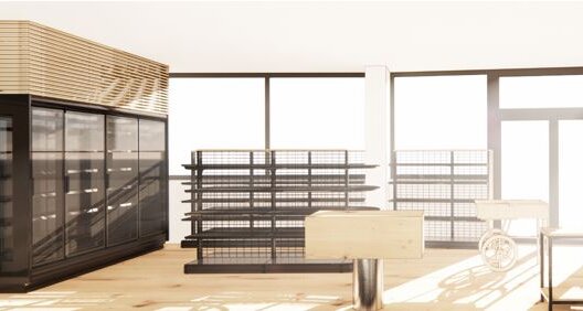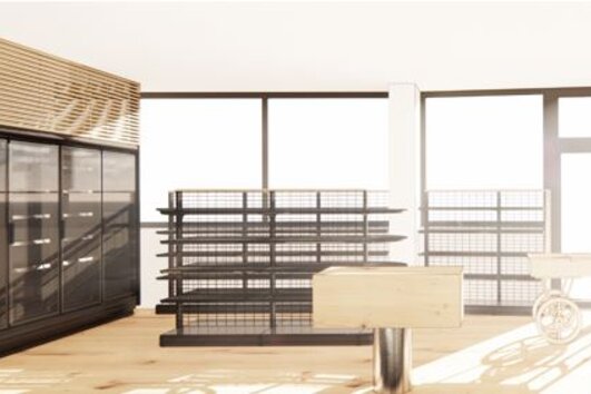 Holz und Betonoptik sowie die CI Farbe ziehen sich durch beide Bereiche und die flexiblen Regalsysteme setzen ausgewählte Warengruppen perfekt in Szene.