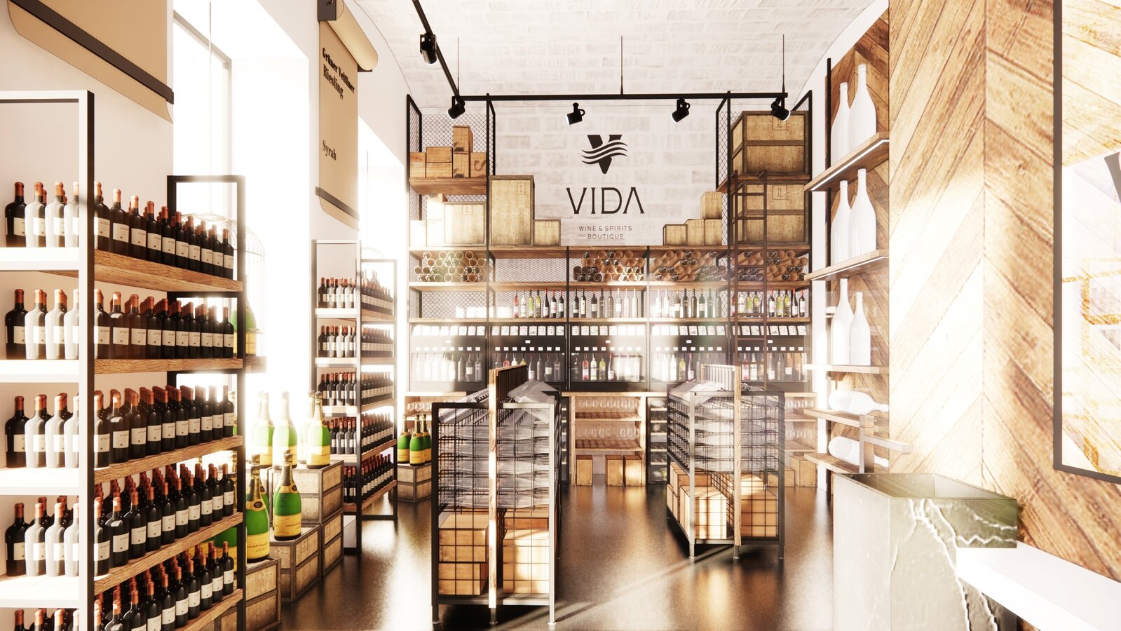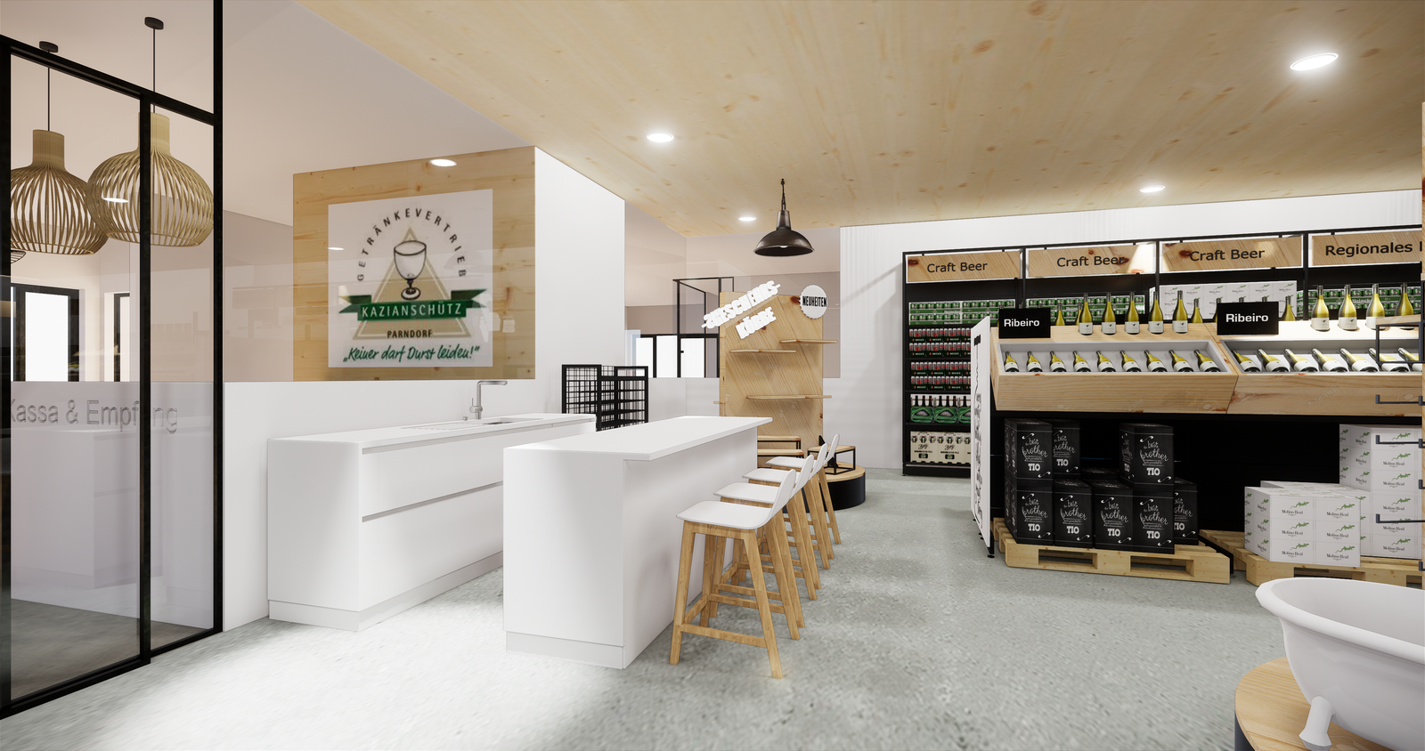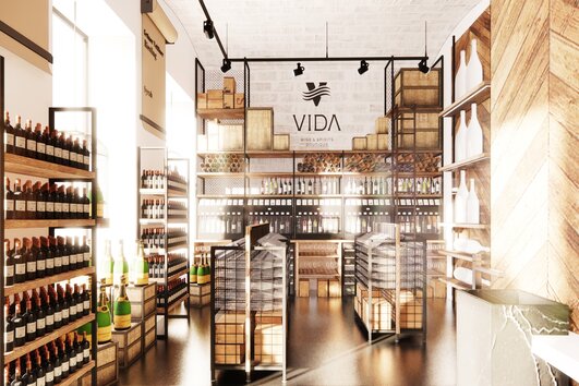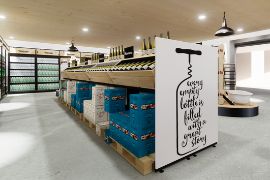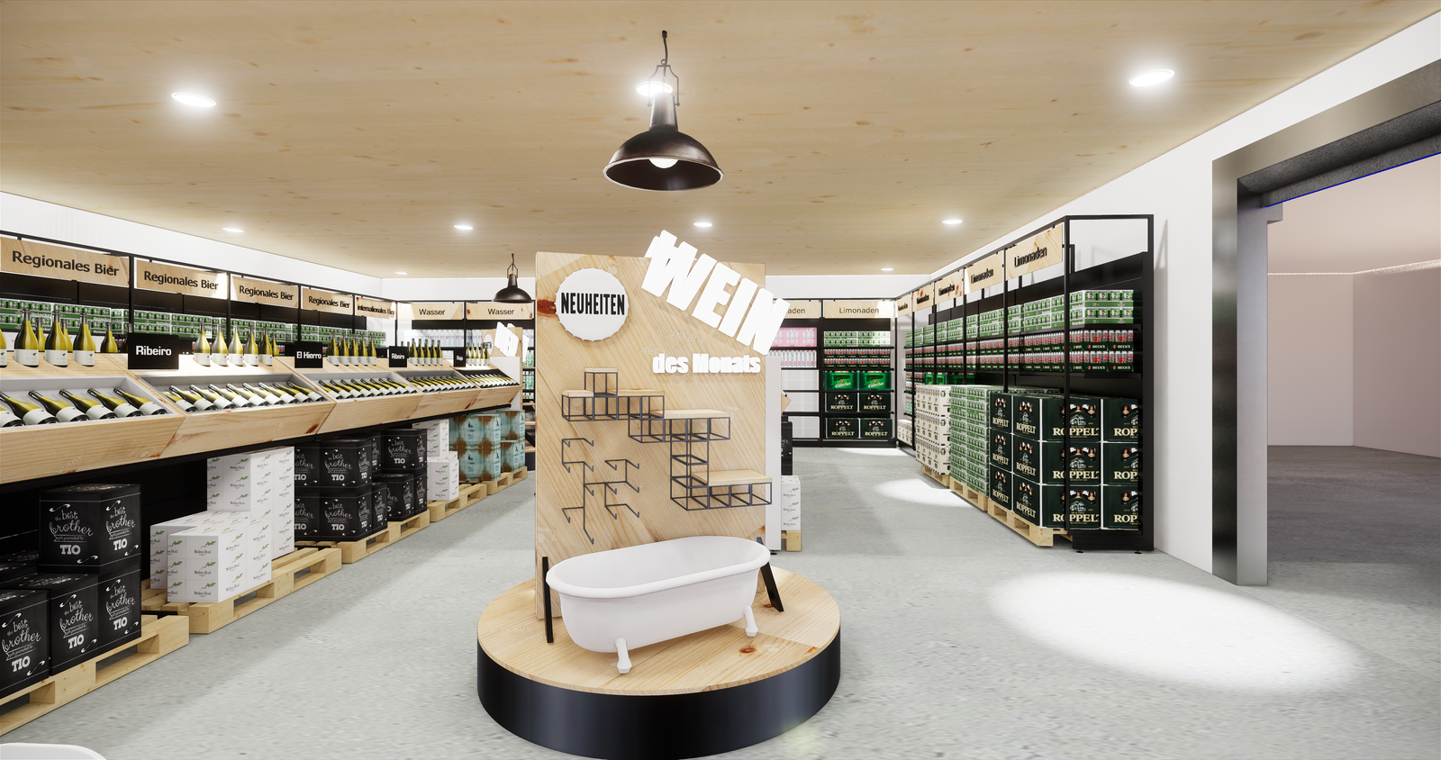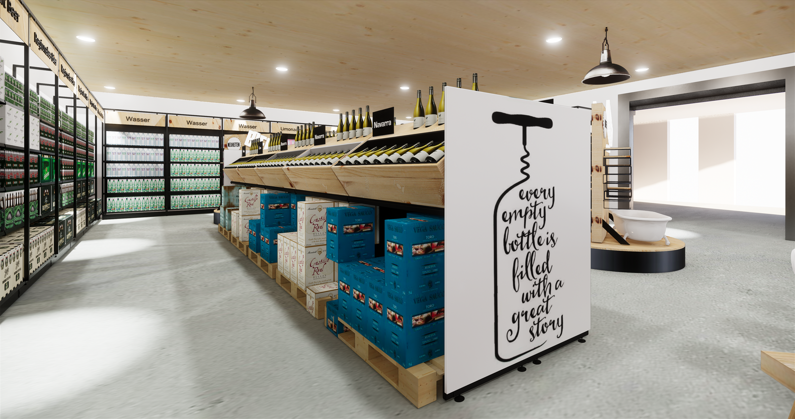 Die schlichten dunklen Regalsysteme fügen sich optimal in die moderne Architektur ein. Aktions Warengruppen, die besonders hervorgehoben werden sollen, steht eine Art Bühne zur Verfügung um die Aufmerksamkeit der Kunden auf sich zu lenken. Auch das Zusammenspiel einer Verkostungsinsel bindet sich perfekt in das Gesamtbild ein. Der Betonboden und die dunklen Regale stehen im perfekten Kontrast zu den hellen Farben und warmen Holztönen, und bieten dem Wein die Bühne und Inszenierung unterstützt durch Visual Merchandising.