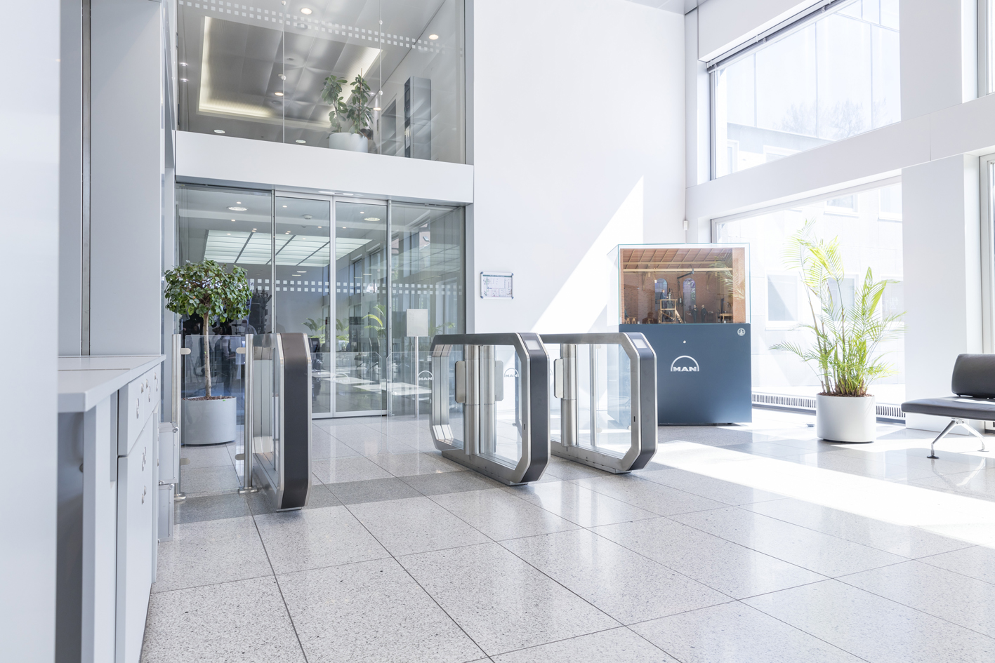 Nähern sich Mitarbeiter und Besucher dem Verwaltungsgebäude, fällt diesen sofort die moderne und einladende Fensterfront auf. Eine Designidee, die sich konsequent im Empfangsbereich fortsetzt. Helle Farben, eine reduzierte Einrichtung und das edle Galaxy Gate begrüßen die Eintretenden. "Uns hat die stilvolle Konstruktion des Galaxy Gate aus hochwertigem Edelstahl und Glas sofort angesprochen. Es passt perfekt in die Atmosphäre des Foyers", zeigt sich Pudel begeistert. Der dezente MAN-Schriftzug auf den Schwenkarmen sowie anthrazitfarbene Applikationen im Gehäuse verströmen individuelle Eleganz. Dort ist auch das RFID-Lesegerät bündig und deutlich sichtbar angebracht. Die grün oder rot leuchtende LED-Anzeige im Handlauf signalisiert leicht erkennbar die Zugangsberechtigung. Pudel betont: "Ästhetik, Komfort und Funktionalität spielen eine wichtige Rolle. Schließlich sollen sich die Mitarbeiter sowie Besucher und Kunden willkommen fühlen."