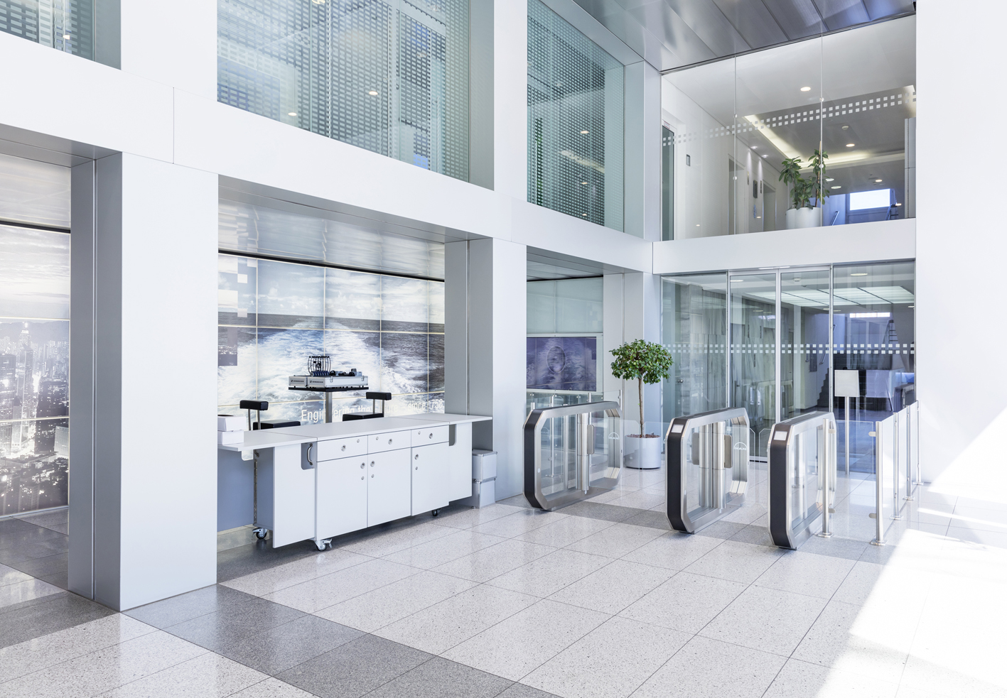 Effizienz-Optimierung ist eine Maxime für wirtschaftliche Produktivität, Mitarbeiter-Motivation eine andere. Das gilt auch für MAN Diesel & Turbo in Augsburg und die ca. 4000 Beschäftigten aus verschiedenen Bereichen, die tagtäglich dafür sorgen, dass der Betrieb läuft. Für sie beginnt der Arbeitstag bequem und völlig reibungslos. Denn im lichtdurchfluteten, freundlichen Foyer des Verwaltungsgebäudes werden sie von der edlen Zutrittsschleuse Galaxy Gate von Wanzl begrüßt. Die Mitarbeiter schätzen den komfortablen Empfang. Zugangskarte zücken, Zutrittsberechtigung scannen lassen und schon öffnen sich die Arme. Hierfür ist im Gehäuse des vollautomatischen 'Portiers' ein RFID-Lesegerät integriert. Zeitgleich mit der Authentifizierung werden die Beschäftigten im Personalmanagement-System registriert - ein für alle Beteiligten angenehmer Start.