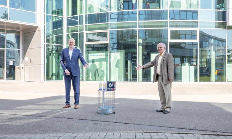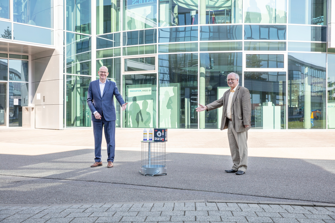Jede Hilfe zählt, denn es geht nur gemeinsam! Diesem aktuell stark geforderten Credo folgt Wanzl und unterstützt natürlich kostenfrei die Katastrophenschutzbehörde Günzburg mit 1.000 Litern Desinfektionsmittel und 5.000 Atemschutzmasken der Klasse FFP2. Dafür bedankte sich der amtierende Günzburger Landrat Hubert Hafner herzlich beim Leipheimer Unternehmen.