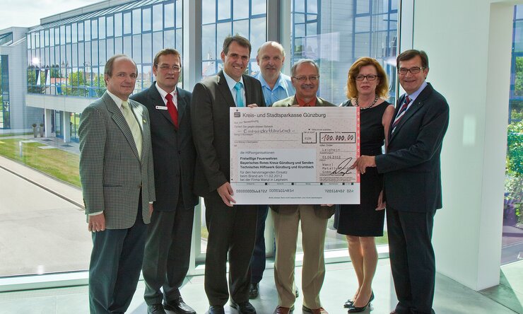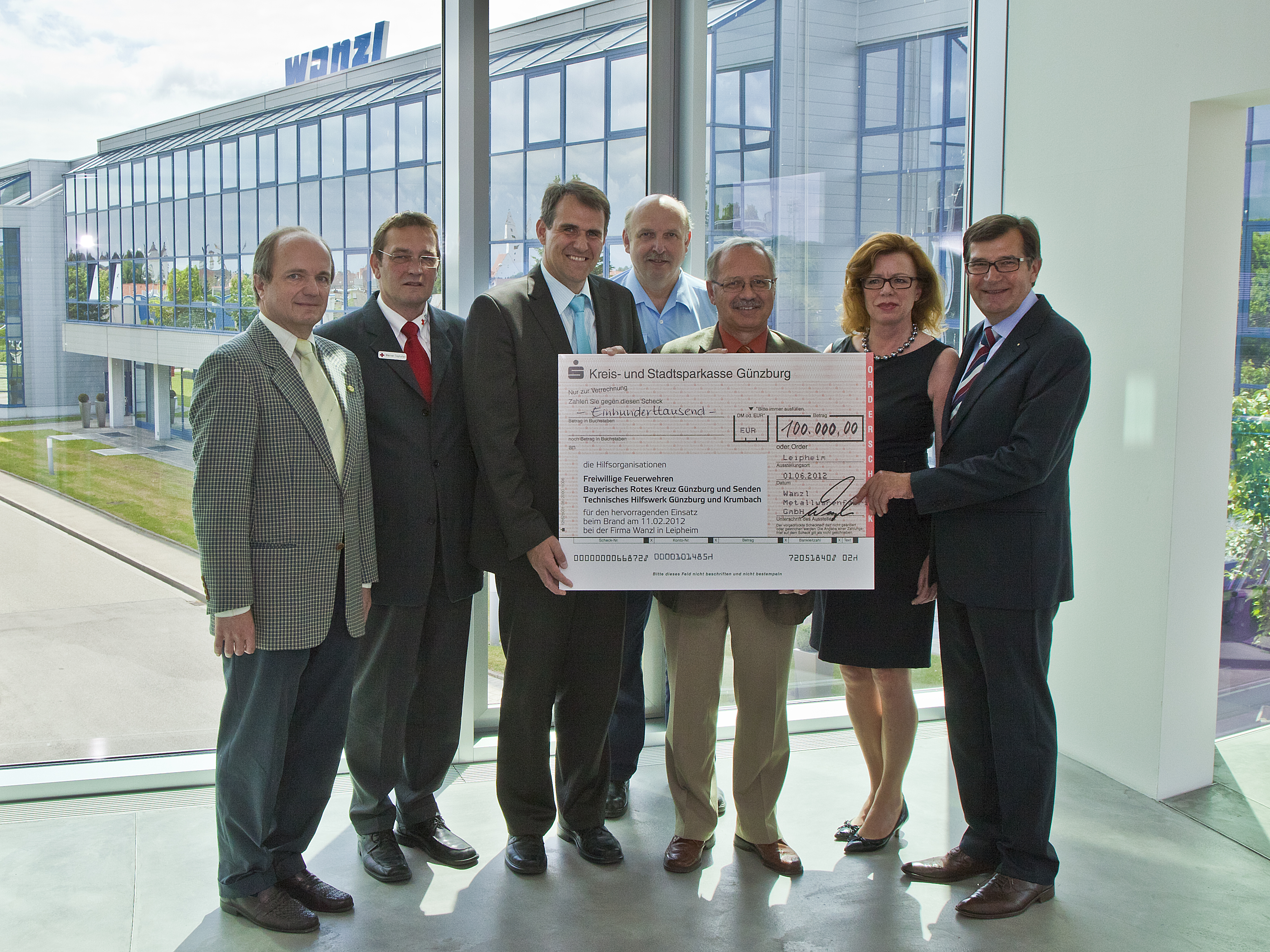 Exakt 100.000 Euro spendet die Firma Wanzl den Freiwilligen Feuerwehren sowie den Ortsgruppen des Technischen Hilfswerks und des Bayerischen Roten Kreuz, die bei dem Großbrand in Leipheim bei Temperaturen bis -14° C im Einsatz waren.
