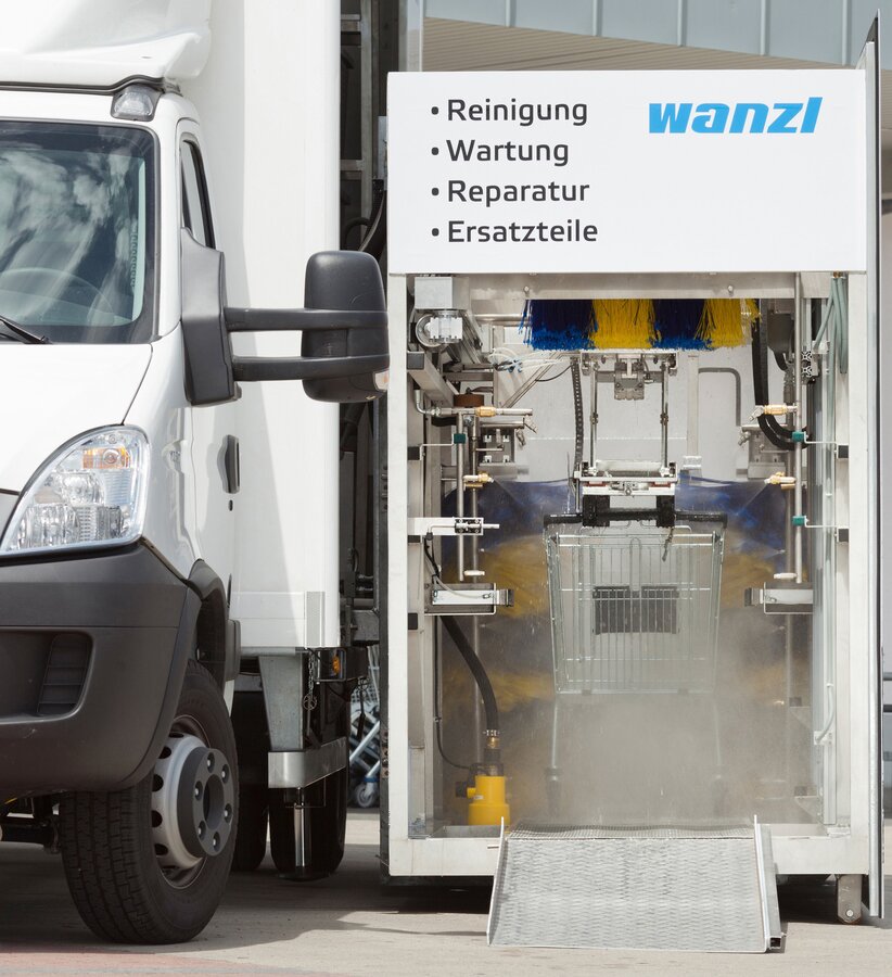 Wanzl-Service Trolley Star: Über tausend Einkaufswagen können täglich durch die Waschstraße des Spezialmobils laufen. Vom ersten bis zum letzten Wagen ist die Reinigung gründlich und hygienisch einwandfrei bis ins Detail. Ein geschlossener Wasserkreislauf mit Wasseraufbereitung sowie der Einsatz biologisch abbaubarer Reinigungsmittel schützen die Umwelt.