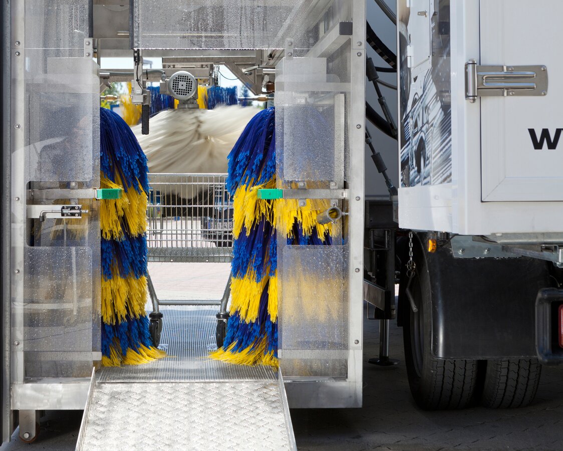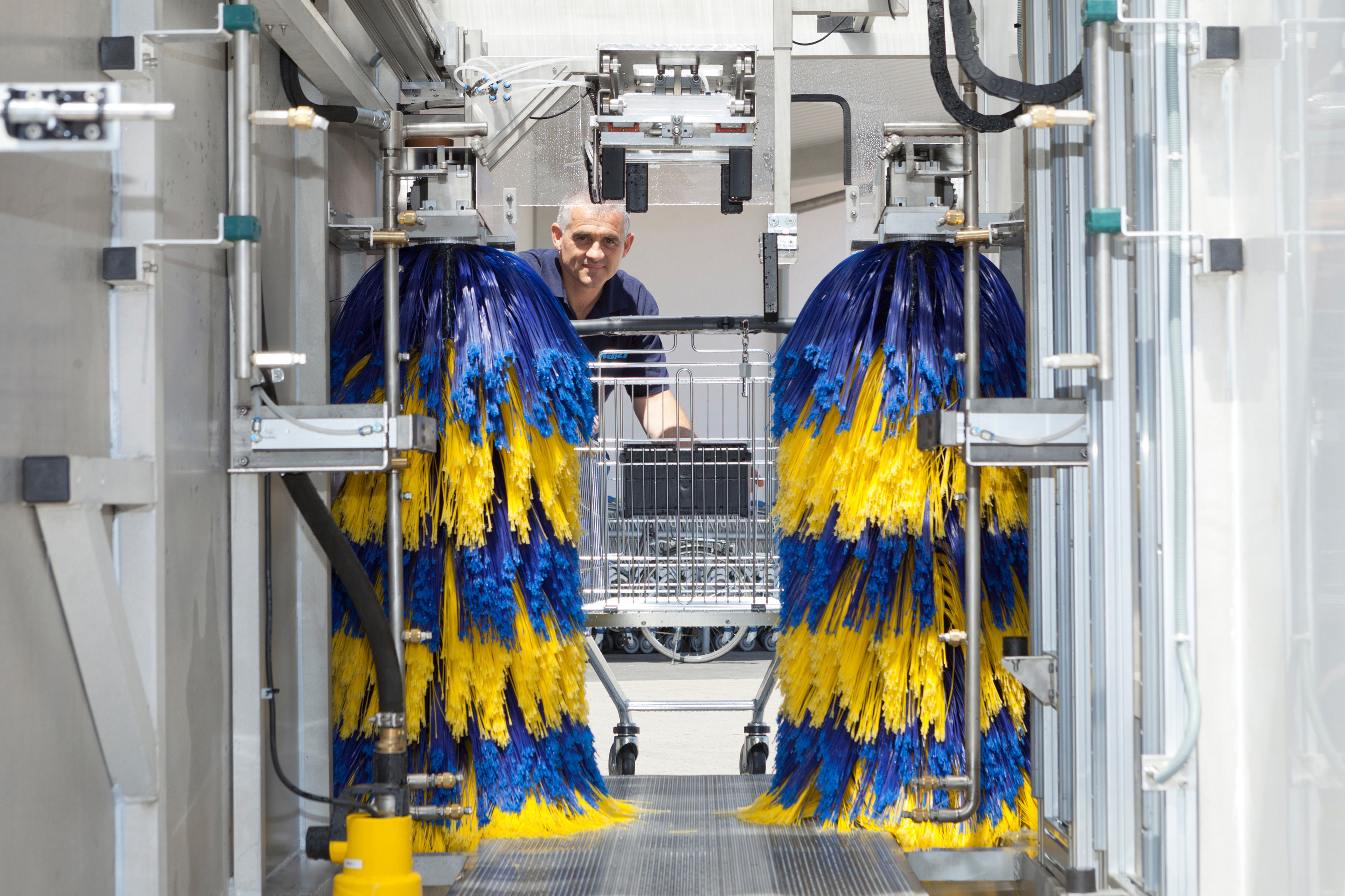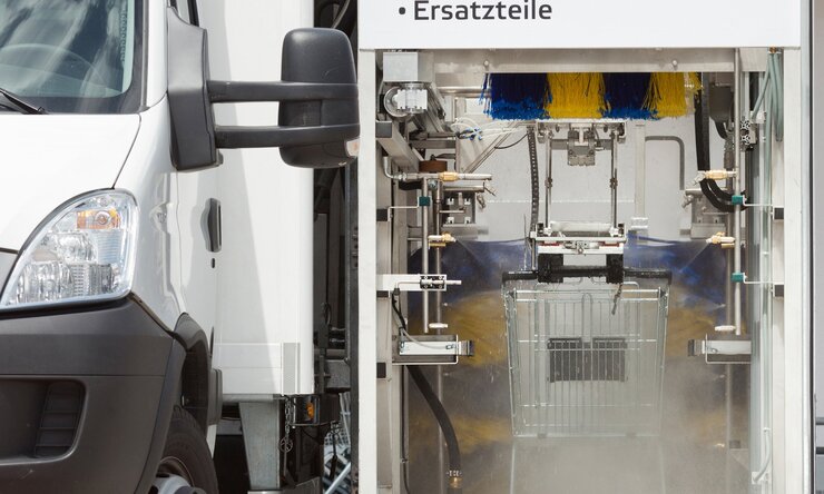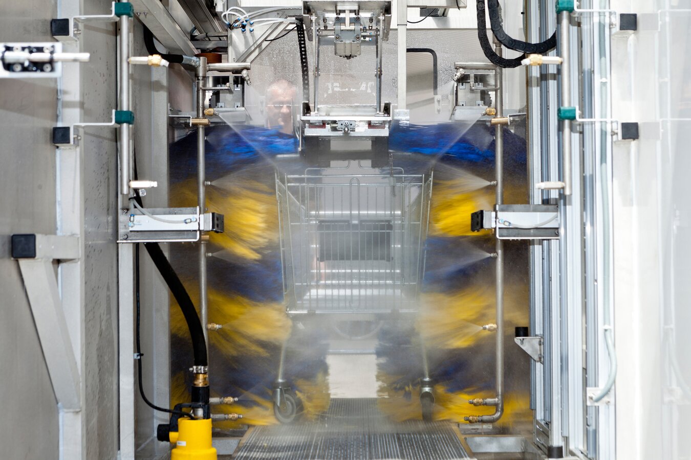 Im mobilen Spezialfahrzeug, das ganz autark Wasser und Strom mitführt, findet im Anschluss an den technischen Service die Einzelreinigung statt. Die integrierte Waschstraße bietet mehrere auf den jeweiligen Einkaufswagentyp abgestimmte Programme, das maschinelle Verfahren inklusive Desinfektion der Einkaufswagengriffe und Glanztrocknung sorgt für eine konstant hohe Sauberkeit vom ersten bis zum letzten Wagen. Der Reinigungsprozess läuft für den kompletten Wagenpark simultan, zügig und zeiteffizient ab, damit die Wagen schnell wieder zum Einkaufseinsatz zurückkehren. Denn nur ein funktionierender Einkaufswagen bringt Umsatz.