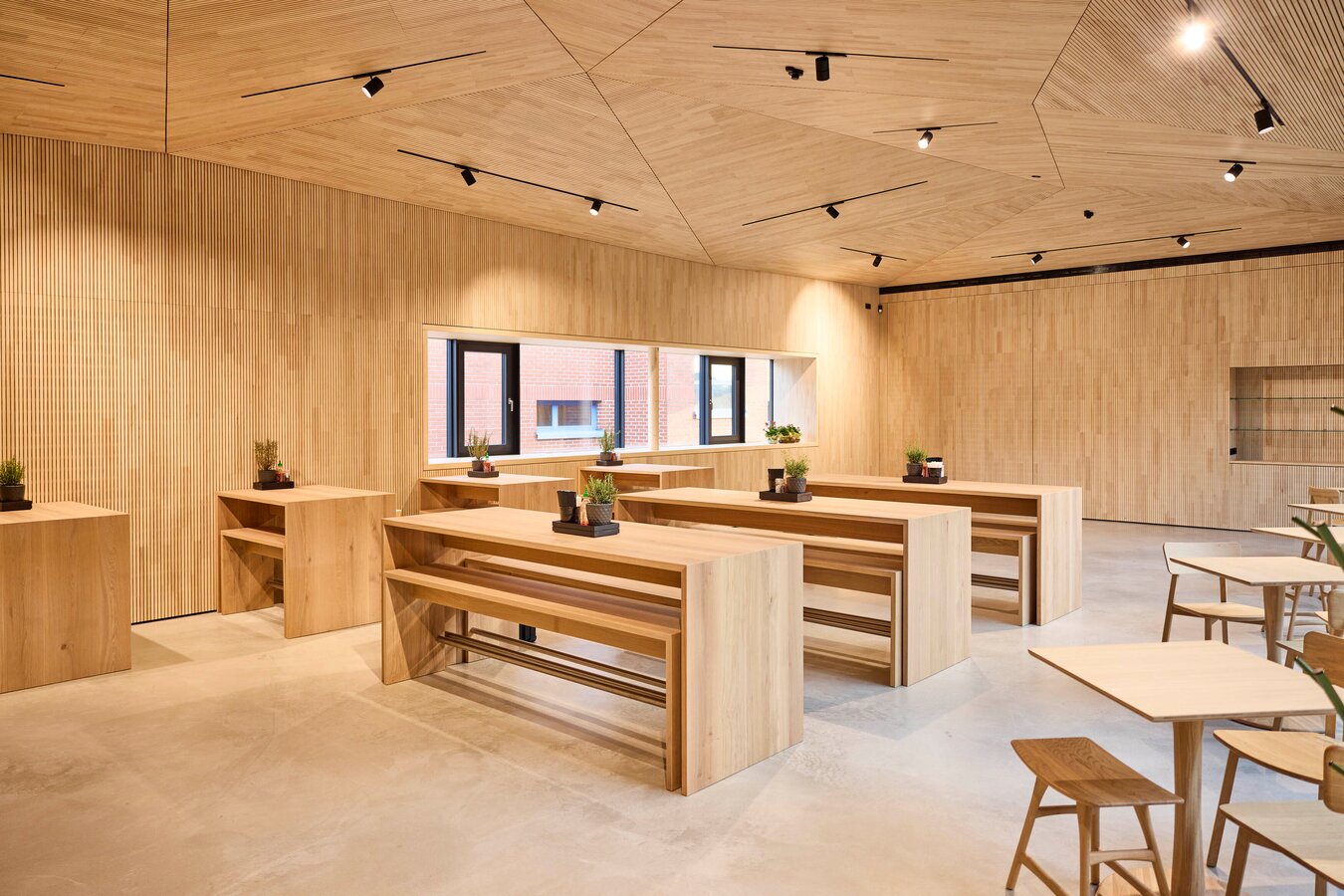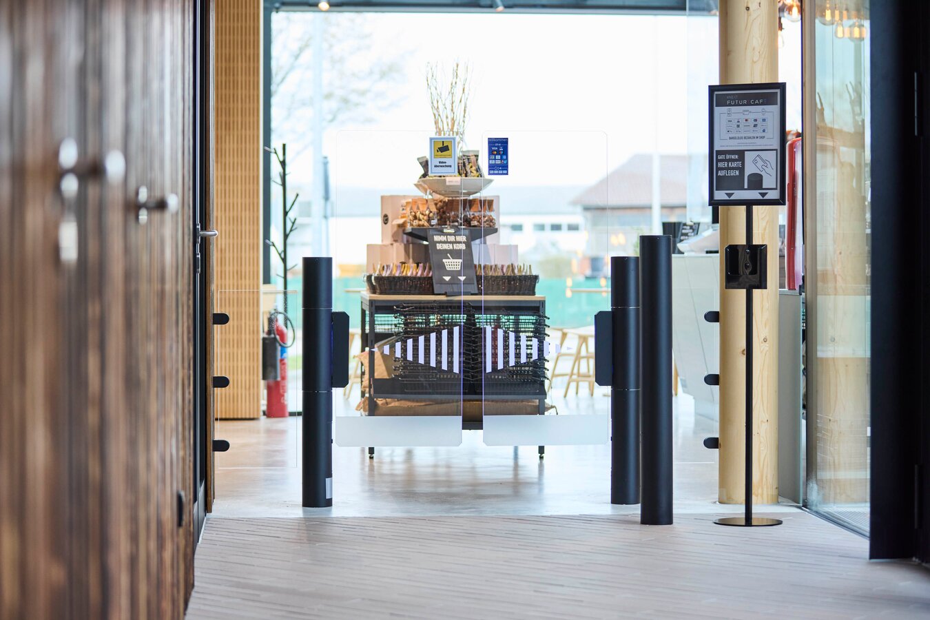 Von außen verleiht eine dunkle Holzfassade dem Gebäude seinen markanten Charakter. Im Inneren öffnet sich der Raum mit hellem Holz und großzügigen Fensterfronten zu einem lichtdurchfluteten Atrium. Schon die eindrucksvolle Architektur des KNEXT Showrooms lässt erahnen, was Besucher im Inneren erwartet: ein Ort der Begegnung – mit innovativem Design, einladender Atmosphäre und hochmoderner technischer Ausstattung. Vor dem Eintritt authentifizieren sich die Mitarbeiter an einer freistehenden Zutritts-Stele per Scan des Firmenausweises. Anschließend öffnet sich das zweiflügelige Eingangsgate Galaxyport von Wanzl und man kann sich frei im Shop und Restaurant bewegen. „Der Zutrittsprozess ist wie das gesamte Ladeninterieur flexibel und kundenspezifisch anpassbar. Genauso denkbar wäre eine Zutrittsschleuse mit integrierter Leseeinheit für EC- und Kreditkarten“, erklärt Christoph Kübel, Key Account Manager Digital and Access Solutions bei Wanzl.