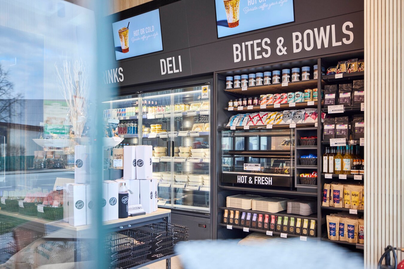 Im Verkaufsbereich steht eine große Auswahl an gekühlten Getränken, gesunden Mahlzeiten sowie leckeren Snacks aus der Region für die Gäste des Mitarbeiterrestaurants bereit. Ein besonderes Highlight ist das integrierte FutureCafé. Auf gerade einmal 9 m2 bereiten drei Roboterarme in einem gläsernen Café vollautomatisiert Kaffee-Spezialitäten in Barista-Qualität zu, brühen Tees frisch auf und servieren handgemachtes Gebäck. Harald Rohrmoser, Geschäftsführer von KNEXT sowie langjähriger Küchenchef in der Spitzengastronomie, berichtet: „Unser FutureCafé in der BMW Welt in München war 2024 eines der ersten robotergestützten Cafés Deutschlands und eine Revolution auf dem Markt. Sämtliche Handgriffe und Kenntnisse eines erfahrenen Profi-Baristas wurden genau analysiert und in einem intelligenten Automatisierungskonzept abgebildet. So liefert das FutureCafé feinsten Kaffeegenuss.“ Wer seine kulinarische Wahl getroffen hat, genießt sie wahlweise in der stilvollen Lounge, dem exklusiven Wintergarten oder – bei schönem Wetter – auf der sonnigen Piazza. Gut gestärkt und entspannt geht es anschließend zu einer der beiden Self-Checkout-Kassen. Den Showroom verlässt man schließlich wieder über den Galaxyport.