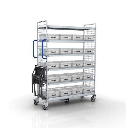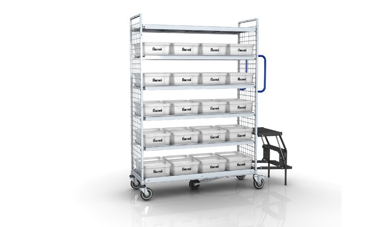 Das Produktsortiment, das flaconi in Berlin lagert, ist umfassend wie vielfältig: Von Naturkosmetik über Luxusprodukte bis zur klassischen Nivea Creme finden Tuben, Glasfläschchen und allerlei zerbrechliche Tiegel ihren Weg in die Körbe und Fächer des Wagens. Entsprechend ausgerüstet muss er sein. Durch seine Systembauweise konnte der KT3 an die speziellen Wünsche des Beauty-Pioniers angepasst werden. „Um unsere Waren effizient zu transportieren, hat Wanzl den KT3 individuell für uns konfiguriert. Alle Wagen verfügen neben dem 5. Rad und der Leiter über ein zusätzliches Griffbügelpaar, damit sie komfortabel durch die Gänge geschoben werden können. Das Modell für die Einlagerung haben wir zudem mit einer Gitterrückwand und vier Einhängeetagen ausgestattet, für den Pick wiederum haben wir sechs Einhängeetagen gewählt“, erklärt Steffen Christ.