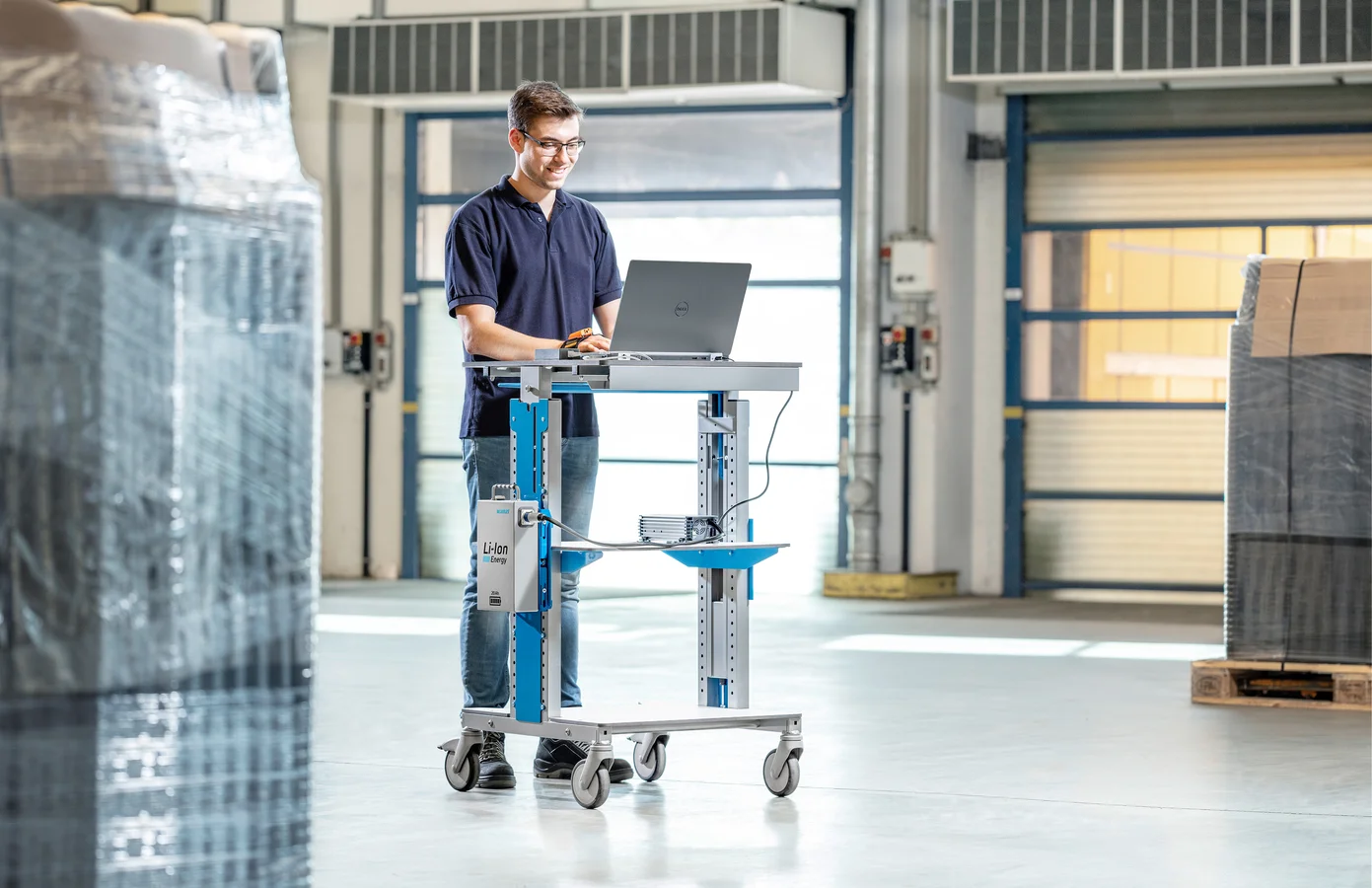 The concept of the mobile table trolley was born out of an everyday challenge in distribution centres: time is money, whether for incoming goods inspections, warehouse accounting, labelling or inventory. Manual processing often involves long walks back to the office. With four castors and a height-adjustable tabletop, Wanzl’s trolley becomes a mobile desk that’s always precisely where its needed, This eliminates unnecessary trips and saves time. Whether laptops, scanners or label printers, the on-the-move office has enough space for the required technology, as well as the optional extra of a mobile power supply provided by means of Wanzl’s portable lithium-ion battery. It can be attached to the side or the middle shelf by means of an adapter plate. A voltage converter with integrated socket can be connected to the battery. If the battery is mounted on the side, the fixed middle shelf below the tabletop serves as a storage area for accessories and office supplies. As an option, an additional shelf can be added to the table trolley. Essential cables are stored unobtrusively in a conduit at the rear of the tabletop – to keep things neat and tidy in the workstation. This trolley is not only mobile, but also flexible. Thanks to its height-adjustable table top, it can be adapted to individual requirements such as body size. It can be adjusted in 25 mm increments using a metal bracket, making it ergonomic and suitable for a wide range of users. A recess in the front of the trolley provides additional legroom when the trolley is pushed. Two brakes ensure solid positioning. If an additional work surface is required, the tabletop can be upgraded at a later date.