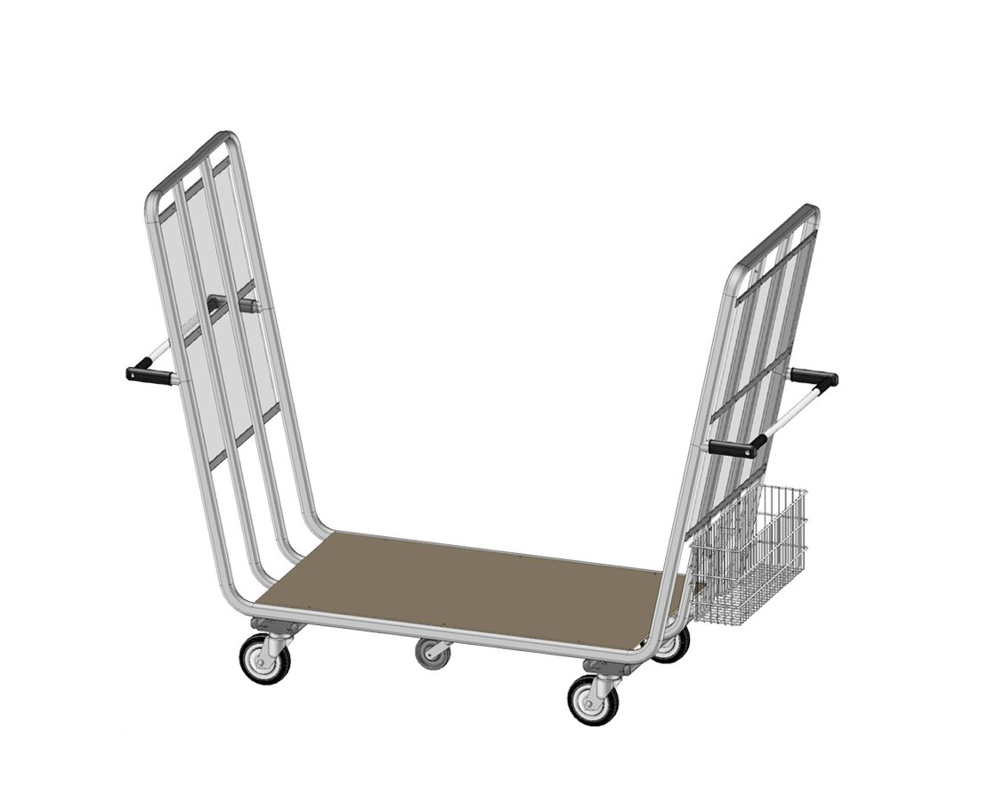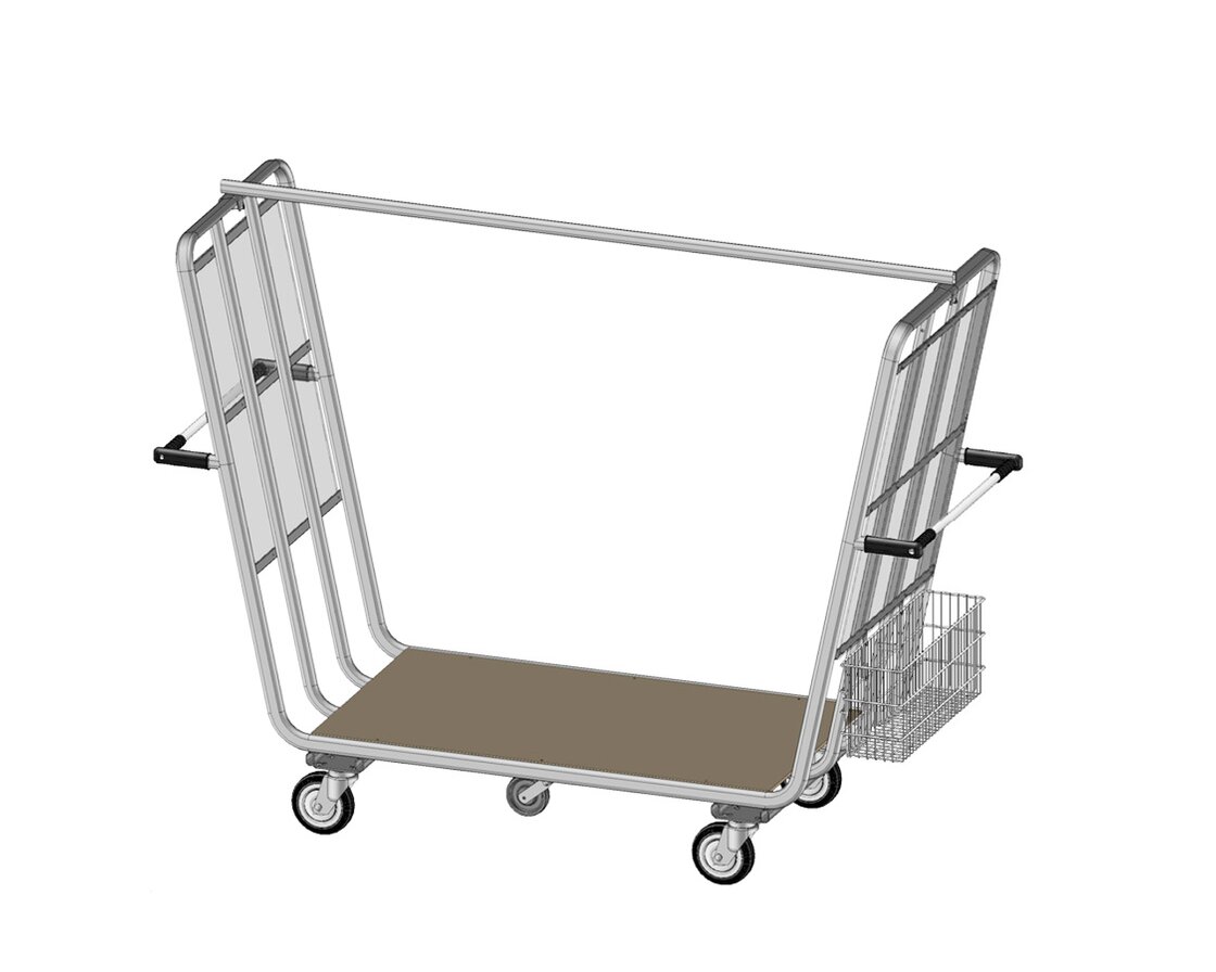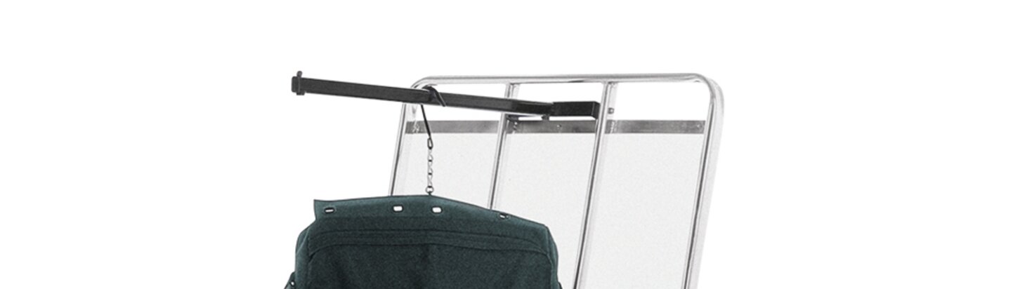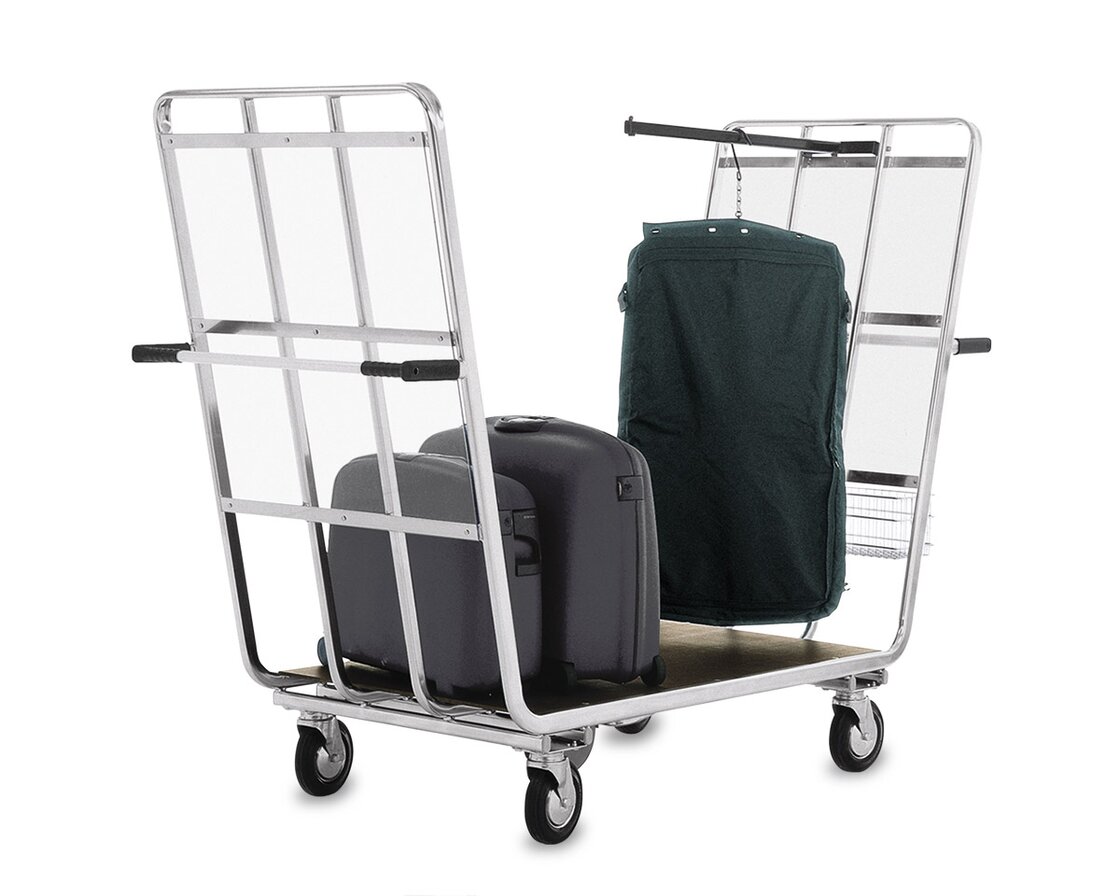 The Wanzl model for transporting luggage for people travelling in groups has a large capacity for luggage of varying sizes and formats. In addition, the sophisticated technical features also mean that it is still very comfortable to push and steer. An optional locking brake prevents the trolley from rolling away unintentionally during loading and unloading. Also available with clothes rail on request. The load capacity of the trolley is 750 kg.