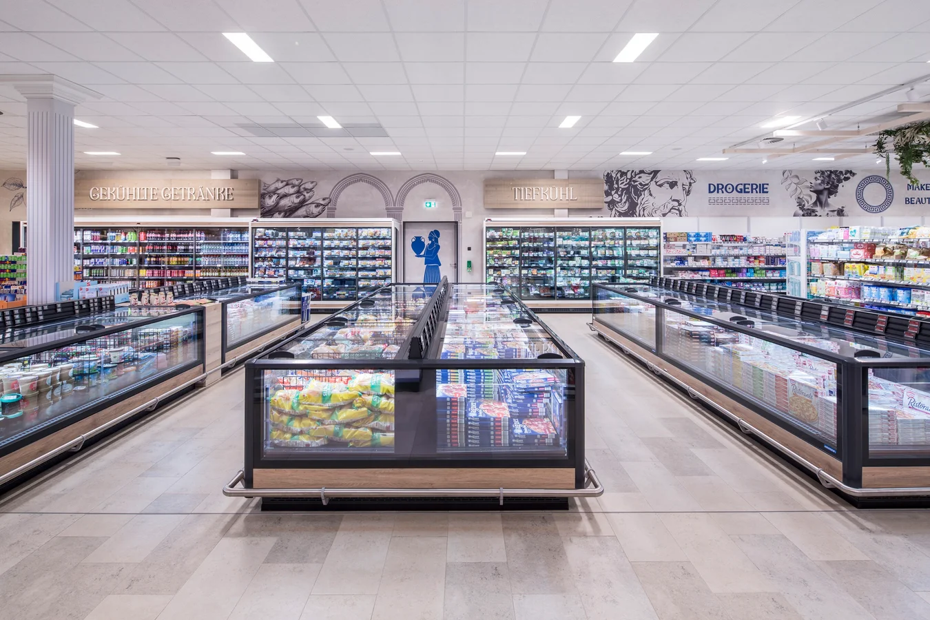 Inspired by the owner's Greek roots, the Wanzl team focused on authentically integrating Hellenic style elements into the supermarket. The shop design, created by Tino Pilharcz, Senior Director at Wanzl, and Bernd Kast, Head of Creative Design, is characterised by typical