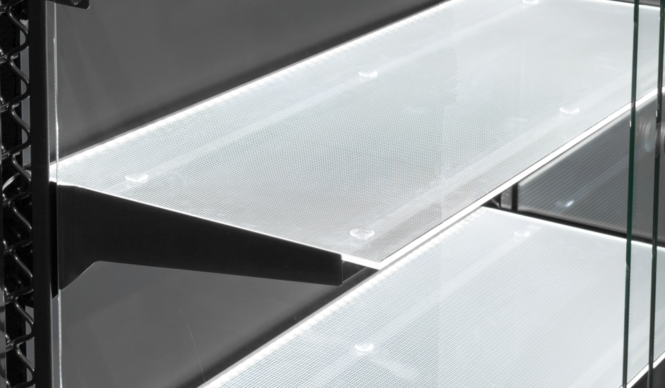 Shelves can be adjusted so that they hang at different angles, completely cable-free. Shelf lighting is guaranteed, whatever the inclination.