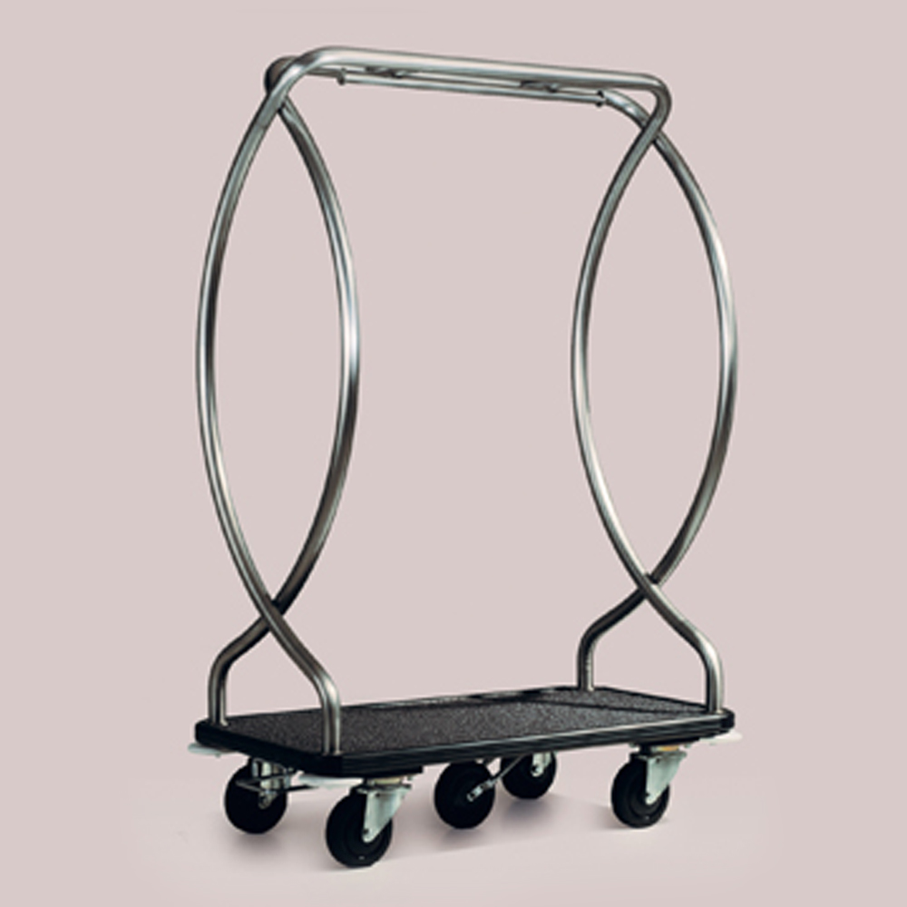 Another innovation is the Wanzl Premium GS-Trend luggage collection trolley with its attractively shaped, unmistakeable design that is eye-catching and emphasises the stylish appearance of design hotels. The Premium GS-Trend model combines optimum workmanship with high manoeuvrability and well-thought-out functionality. For instance, the sturdy case storage area offers an extraordinarily large capacity – at the same time the items of luggage cannot slip due to the crossed metal tubes. In addition, a clothes rail for clothes bags is integrated into the high-grade steel tubular construction. Clothes rail and tubular construction can also be supplied in the CI colours of the hotel upon request. The high quality of Wanzl materials and surfaces guarantees their long and visually perfect service life in all cases. The 5th castor mounted centrally under the trolley ensures safe steering and manoeuvring, even around its own axis and even with a fully-loaded trolley and in narrow corridors. At the same time, the surrounding bumper and the deflectors reliably protect the high-quality hotel interior when transporting luggage. Upon request, Wanzl will additionally equip the new luggage collection trolley with two locking brakes for an immediate stop and therefore for optimal safety.