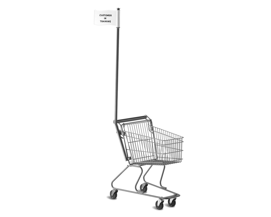 - A specially designed cart for young children to safely maneuver through retail environments to accompany parents or caregiver