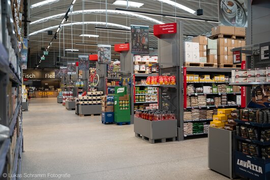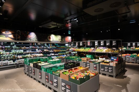 «Siempre adaptamos cada uno de nuestros proyectos a las necesidades específicas de nuestros clientes. Para nosotros, las reuniones en persona, el intercambio intensivo desde el inicio del proyecto y la presencia in situ para una coordinación rápida incluso en caso de imprevistos son fundamentales», explica el jefe de proyecto de Wanzl. «Así nos aseguramos de desarrollar las mejores soluciones posibles para el cliente y todos los oficios según el calendario. Para Wanzl, las soluciones especiales y las adaptaciones individuales de los productos son algo natural». Wanzl ya implementó el diseño y la concepción del supermercado en otros proyectos Transgourmet en años anteriores y los optimizó aún más para Klagenfurt. En las estanterías wire tech 100 y SL de Wanzl, utilizadas para todos los surtidos, se colocaron, por ejemplo, estanterías en color gris corporativo en toda la zona de ventas para una presentación llamativa de los productos con cabeceras de diseño personalizado para el cliente.