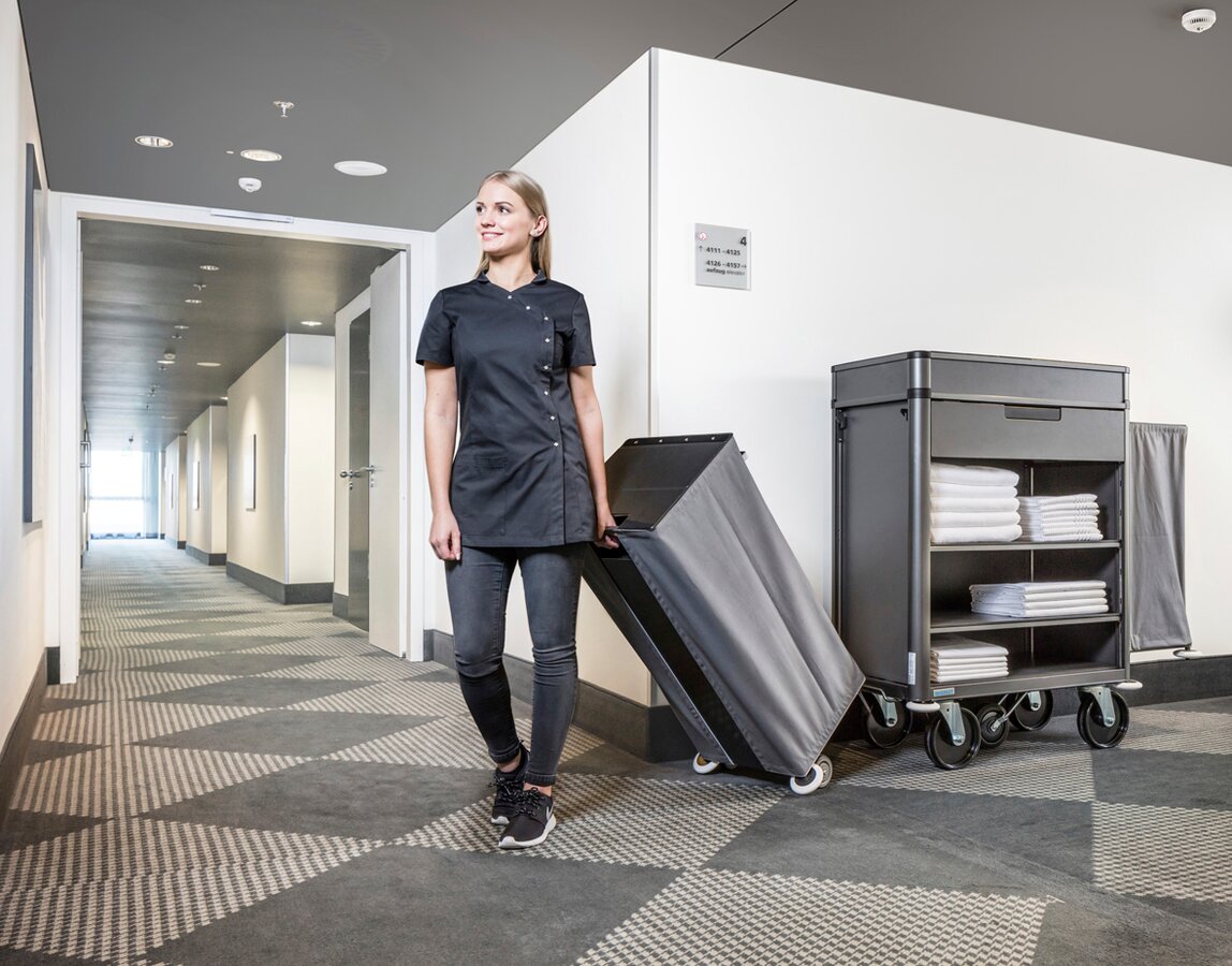 Un discreto, sutil y elegante color negro grafito asegura que el Mundus tenga un aspecto elegante mientras rueda por los pasillos de las distintas plantas. El carro de camarera se funde perfectamente con los cálidos tonos terrosos de la decoración del hotel. Además del diseño, convence por sus versátiles posibilidades de uso y la opción de configuración individual inmediata. Después de todo, en el hotel me and all, que cuenta con vestíbulo, zona de trabajo, salón Sky, gimnasio y 177 habitaciones distribuidas en 10 plantas, no solo la dirección se enfrenta a un reto considerable, sino especialmente el servicio de limpieza. Khanittha Geissler, responsable de todas las tareas operativas y administrativas del servicio de limpieza de este hotel de Dusseldorf, no puede vivir sin los carros para las tareas cotidianas: «Los carros son muy prácticos y presentan un amplio espacio de almacenamiento en su interior, de tal manera que hace que nuestro trabajo sea más efectivo». Se utilizan un total de 15 carros de camarera Mundus adaptados a las necesidades específicas del hotel. Además del chasis con cuatro estantes, dos de los cuales se pueden ajustar de forma variable, hay un soporte para sacos de basura con tapa en el lado derecho para la separación de residuos. A la izquierda se puede colocar un saco de poliéster con un volumen de 110 litros para la ropa sucia.