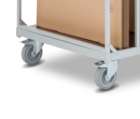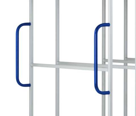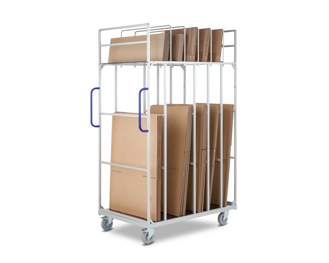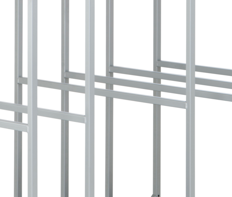 Sivuosat nelikulmaista putkea, poikittaistukien kanssa. Alusta ja kiinni ruuvattu taso, jossa on liukumaton puualusta. 5 lokeroerotinta ylhäällä, 4 alhaalla. Työntökahvat muovipäällysteistä sinistä tai punaista teräsputkea.