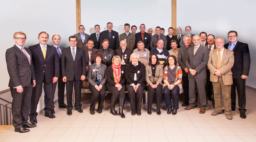 Les directeurs de Wanzl, Frank Derks, le Dr. Hans-Jürgen Sattler, Bernhard Renzhofer et Gottfried Wanzl (en partant de la gauche) ainsi que le président du comité d’entreprise général Dieter Ammicht (rangée du fond, tout à droite), qui partait à la retraite en 2012, et d’autres cadres supérieurs ont rendu honneur aux employés de longue date et méritants. On peut les voir sur la photo aux côtés de collaborateurs qui ont effectué 40 et 25 ans de service à Leipheim.