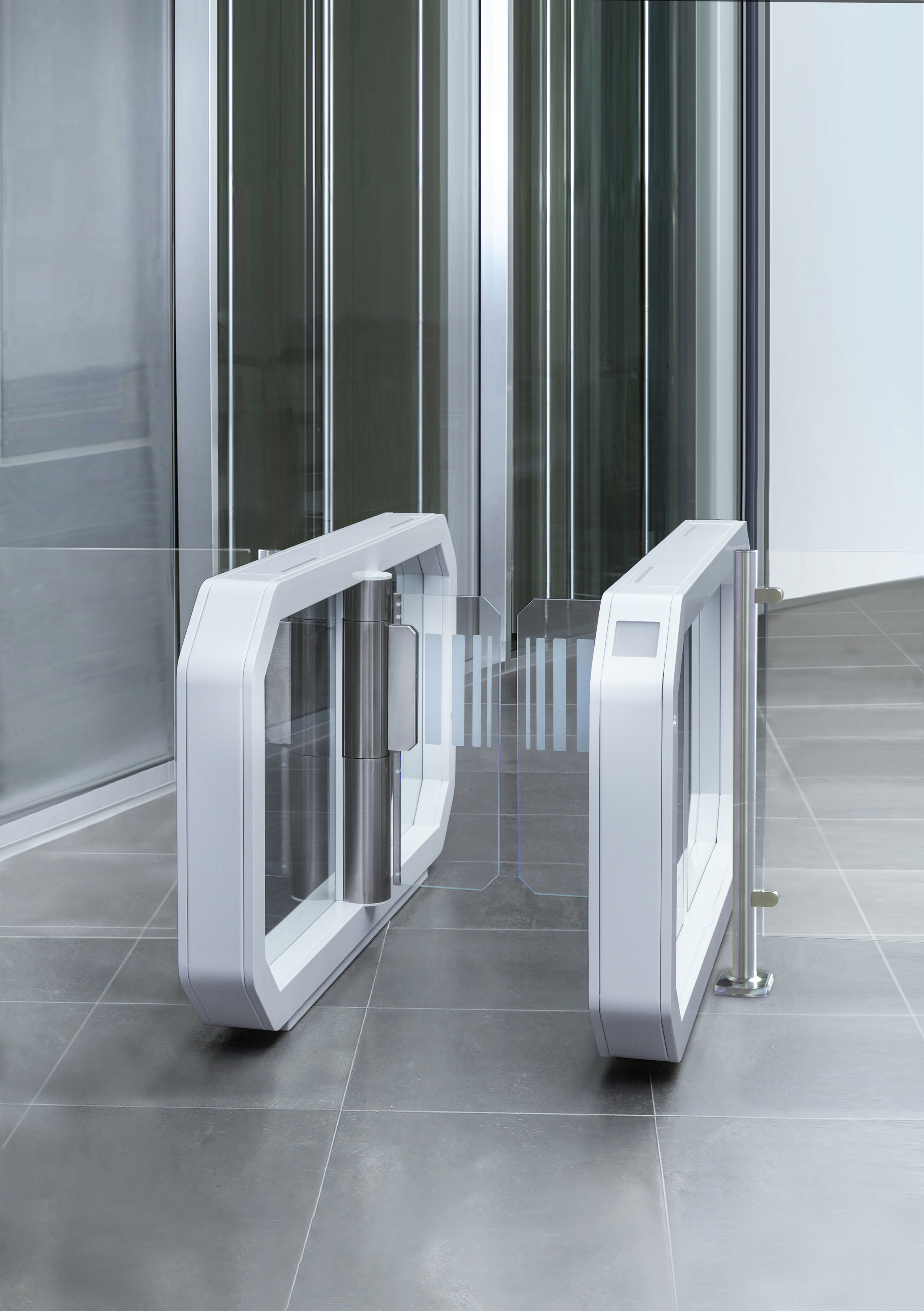 Un capteur au plafond vérifie que le passage est autorisé et correct. En cas de franchissement non autorisé, le système déclenche des alertes optique et sonore tout en fermant aussitôt les bras pivotants. L’accès est autorisé par des unités externes reliées entre elles par interfaces LAN ou par contact sec. Grâce au protocole OSDP (Open Supervised Device Protocol), l’unité de commande du Galaxy Gate est compatible avec les terminaux mobiles, comme les smartphones. Ceux-ci peuvent ainsi s’échanger les données nécessaires à la création d’une commande d’ouverture des bras pivotants. Un emplacement est réservé aux installations de détection d’incendie et de gestion domotique sur la platine de raccordement.