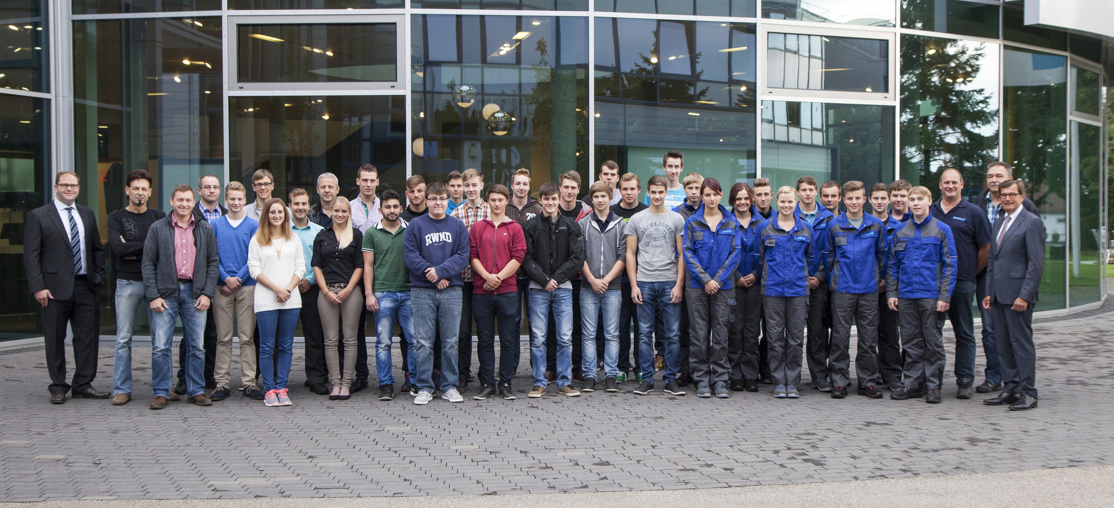 La photo montre les nouveaux apprentis des usines de Leipheim et Kirchheim, accompagnés des cadres et du personnel technique (à partir de la gauche) : Formateurs : Thomas Frahler, Wolfgang Seitz, Stefan Frey (comité d’entreprise), Stefan Wegscheider ; apprentis à Leipheim : Niklas März, Christian Rommel, Corinna Höb, Sebastian Wiesheu, Reinhold Herkommer (formateur), Karolin Stark, Benedikt Riederle, Okan Halatli, Kushtrim Kadriu, Luca Miele, Elias Höck, Daniel Götzfried, Julian Paulheim, Fabian Saumweber, Florian Brandner, Jochen Seitz, Lukas Reifenstuhl, Fabian Kircher, Hans-Peter Schmid, Manuel Siegner, Andreas Schiller ; apprentis à Kirchheim : Hendrik Natterer, Regina Fast, Jennifer Fischer, Haxhi Maliqi, Sarah Frei, Johannes Schneider, Kevin Destani, Maximilian Mayr, Fabian Schneider, Patrick Pfänder, Simon Denk; formateurs : Rudolf Pelikan et Josef Mayr ; Gottfried Wanzl, associé gérant du groupe Wanzl.