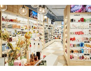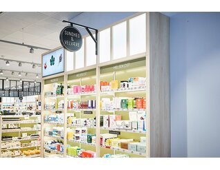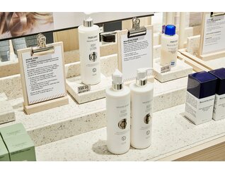 Wanzl a personnalisé les rayonnages en bois filigranes et éclairés pour les adapter aux produits qu’ils présentent : cet équipement en vert olive, en noir, en blanc ou dans une teinte naturelle interagit parfaitement avec les emballages des marques de beauté. De petits podiums imitant le marbre permettent une présentation de produits particuliers qui incite à l’achat et rappellent le décor d’une salle de bains luxueuse. À côté, de petits panneaux informatifs indiquent en détail la composition des produits et comment les utiliser. Les différentes notes design se marient bien au carrelage aspect grès sans pour autant reléguer les produits au second plan.