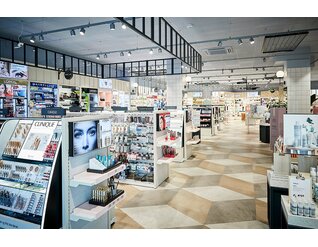 Des éléments à grilles et des pancartes informatives en acier noir sont suspendus au plafond du concept store apportant un contraste à l’aménagement intérieur aux teintes claires. Ils permettent de structurer l’espace et simplifient l’orientation des clients au sein des 350 m² que compte la surface de vente de ce magasin dédié à la beauté. Quelques plantes vertes placées çà et là apportent au décor une touche rafraîchissante. En misant à la fois sur un aménagement esthétique et naturel, ce concept global épuré procure aux clients de Matas M/S la sensation de vraiment se faire du bien.