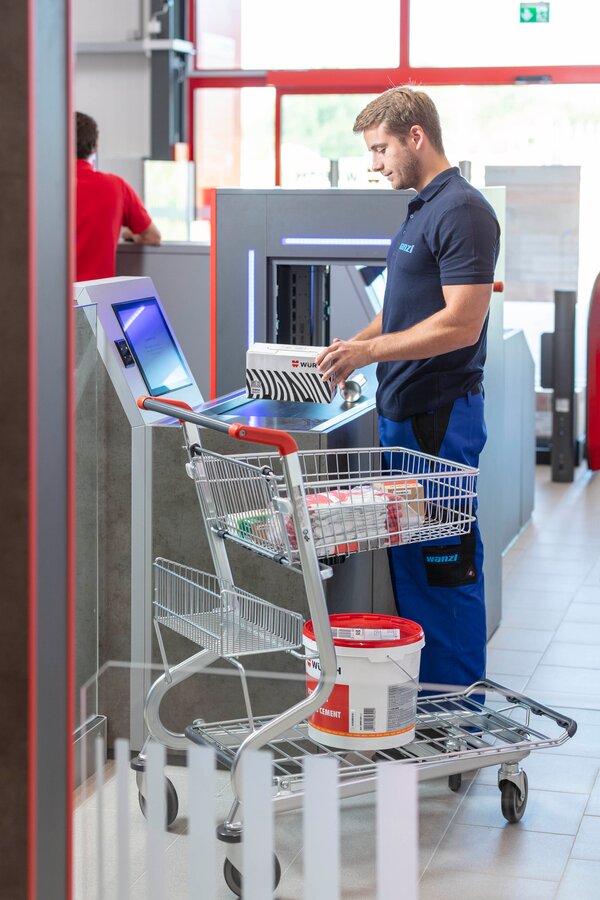 L’élément le plus important pour un fonctionnement parfait de ce format de magasins inédit, c’est la zone de caisses, MADE BY WANZL. Elle comprend un comptoir d’informations pour apporter un service personnalisé et une zone de passage en caisse automatique, dans laquelle le processus de paiement a lieu de façon autonome. La zone de caisses allie habilement une technologie innovante et un design élégant, qui reflètent le cœur de métier de Wanzl. Conçue dans un gris discret avec des touches de rouge, la zone de caisses reprend exactement l’identité visuelle de Würth. Une fois le paiement effectué, un bon de livraison est imprimé. La facture sera envoyée automatiquement quelques jours plus tard.