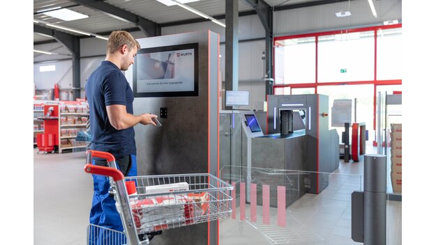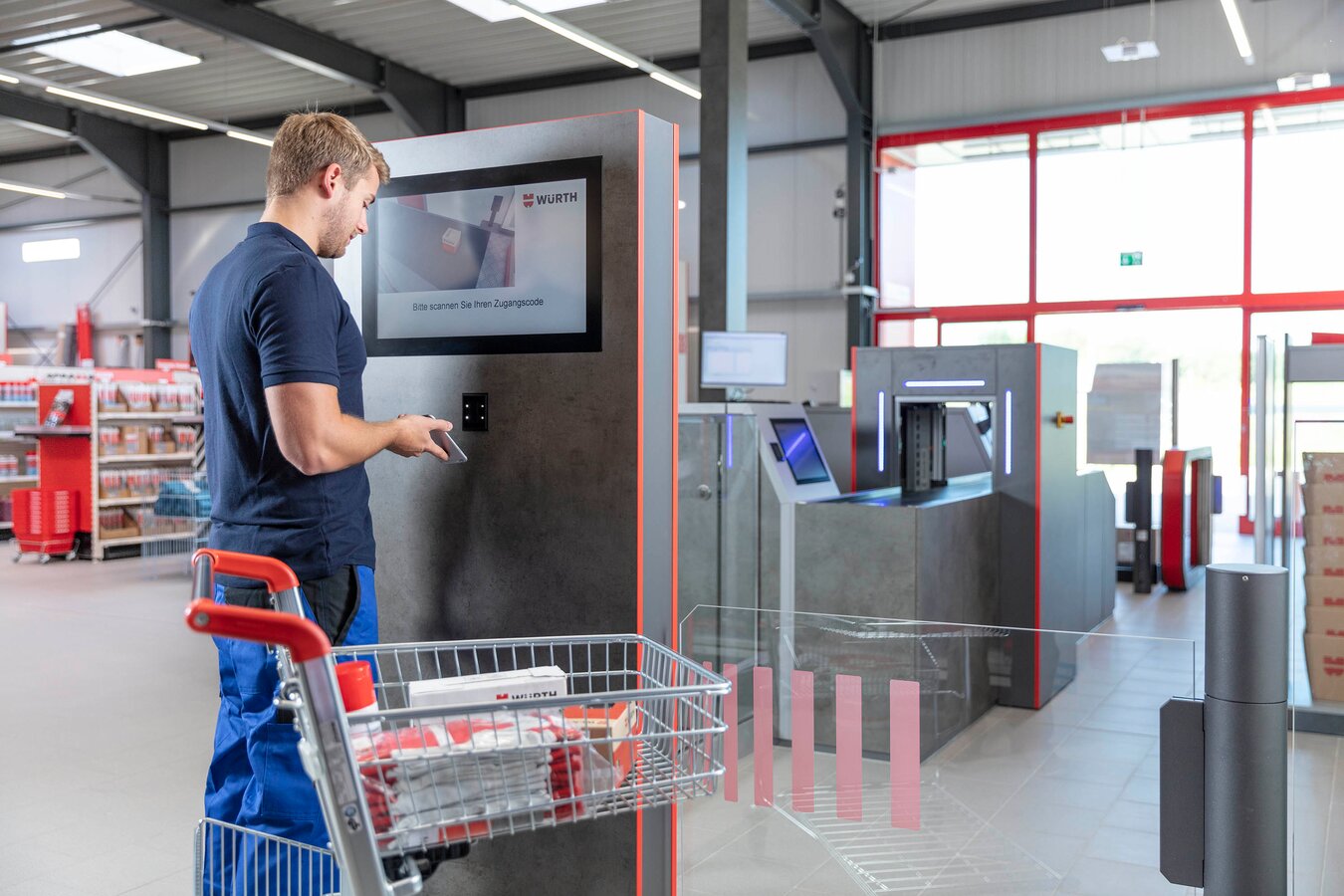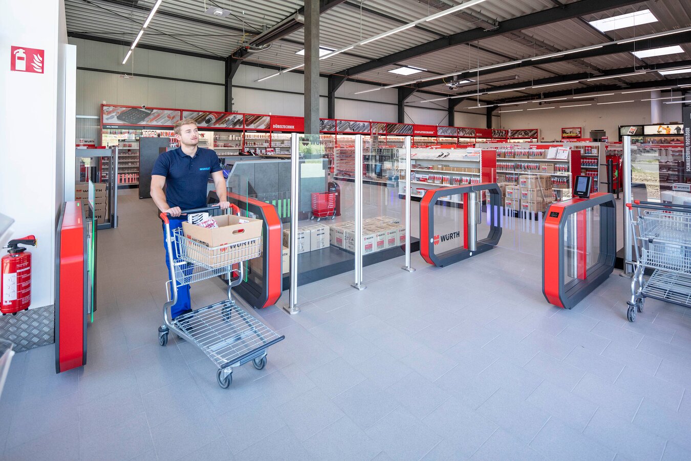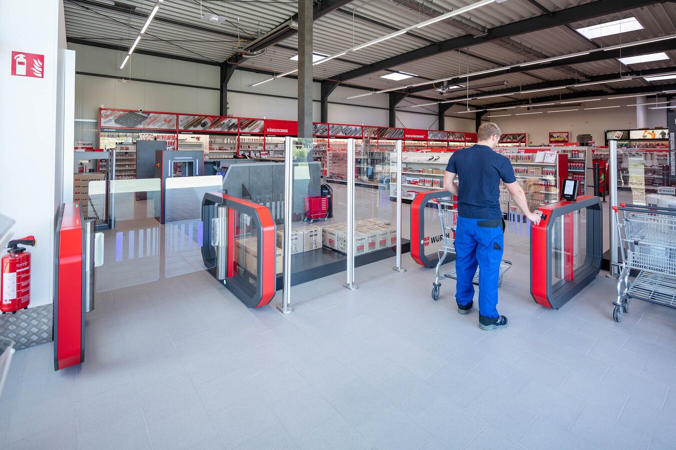 Pendant les heures d’ouverture normales, les clients entrent et effectuent leurs achats comme d’habitude. À partir de 17 heures, ils accèdent au magasin à l’aide d’un code QR et de l’application Würth. Une fois le code QR scanné à l’extérieur du bâtiment, le client pénètre dans la zone d’entrée. Pour l’accès individuel des personnes, une deuxième authentification a lieu au niveau du portillon d’accès Galaxy Gate.