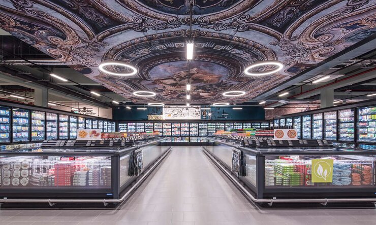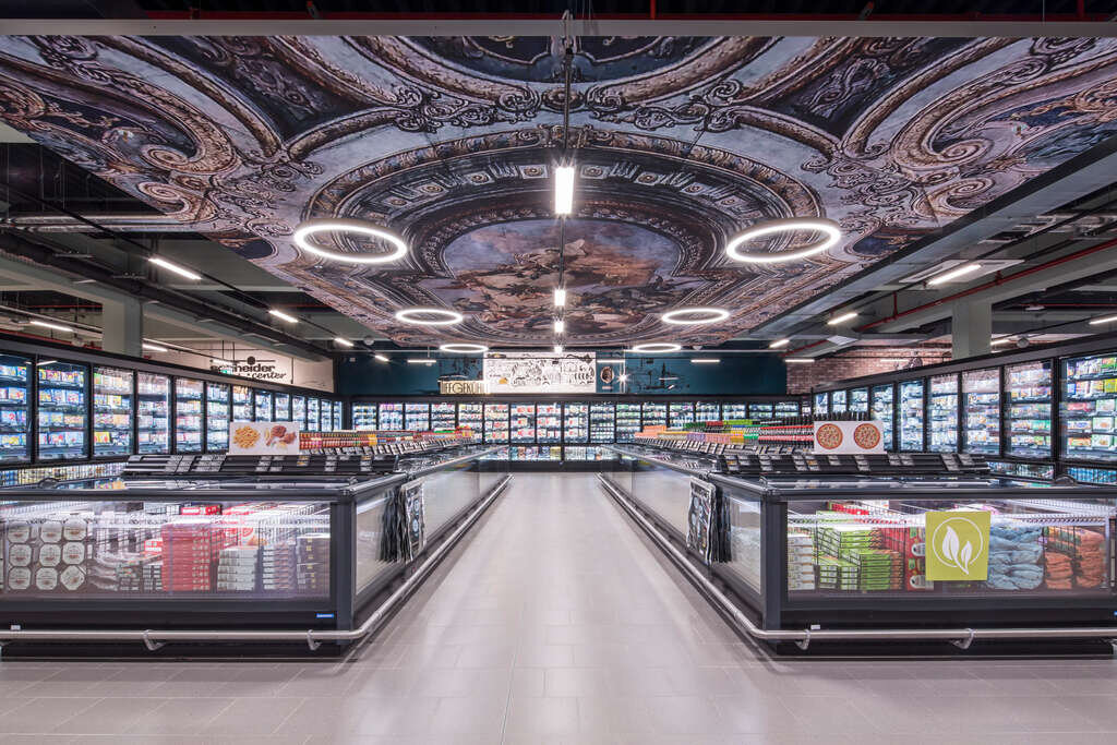 Les clients ont ensuite la possibilité de s’aventurer dans la « caverne du dragon » du rayon des spiritueux. Celle-ci fait référence à la lutte héroïque de Siegfried contre le dragon Fafner pour l’or du Rhin et l’anneau des Nibelungen. Les murs à l’aspect rocheux et les cadres dorés des rayonnages dominent l’espace. En son centre, le casque doré de Siegfried est suspendu, entouré d’un cube également doré et d’entretoises en demi-cercle. Des luminaires flottants à l’aspect de bougies soulignent le caractère mythique et élégant de la pièce. « L’attachement à la région a également sa place dans le rayon des boissons. Nous avons utilisé la façade de la brasserie des frères Maisel comme motif central de l’assortiment de bières, et ce sous la forme d’un graphisme mural », explique Jessica Walburger, Creative Designer chez Wanzl. La régionalité est également le thème central du magasin de la ferme, conçu dans le style d’une ancienne grange. Pour ce « magasin dans le magasin », Patrick Schneider s’approvisionne exclusivement en produits frais et de qualité directement auprès de producteurs locaux qui partagent ses valeurs en termes de qualité et de durabilité. Au comptoir des produits frais, l’épée mythique Notung de Siegfried et le feu qui emprisonnait sa bien-aimée Brünhilde jouent un rôle central. Au-dessus de l’étal de poissonnerie flotte une bûche dans laquelle est encore plantée l’épée, car « seul celui à qui elle est destinée peut l’extraire », peut-on lire en allemand en dessous. Pour attirer les regards, le comptoir des produits frais a été transformé sur mesure avec un effet de flammes à LED. Le magasin met en scène de manière impressionnante l’Opéra des Margraves de Bayreuth dans la section des surgelés. En 2012, l’édifice fut inscrit au patrimoine mondial de l’UNESCO. Désormais, une représentation grandeur nature de son plafond somptueux brille au-dessus des congélateurs du Supercenter EDEKA Schneider. Ici, comme ailleurs dans le magasin, on trouve également des luminaires en forme d’anneau, en référence à l’Anneau des Nibelungen. En référence au deuxième lieu musical de la ville, probablement encore plus célèbre, le Festspielhaus de Bayreuth, les zones alimentaires et non alimentaires sont séparées par une cloison. Le département parapharmacie aborde l’importance du Rhin dans la légende des Nibelungen avec des lustres en forme de gouttes, des éléments de plafond à la surface réfléchissante et un portrait des trois filles du Rhin, Woglinde, Wellgunde et Floßhilde. À la fin de cette expérience d’achat à travers Bayreuth, six caisses de paiement et une vaste zone de libre-service sont disponibles pour un paiement confortable.