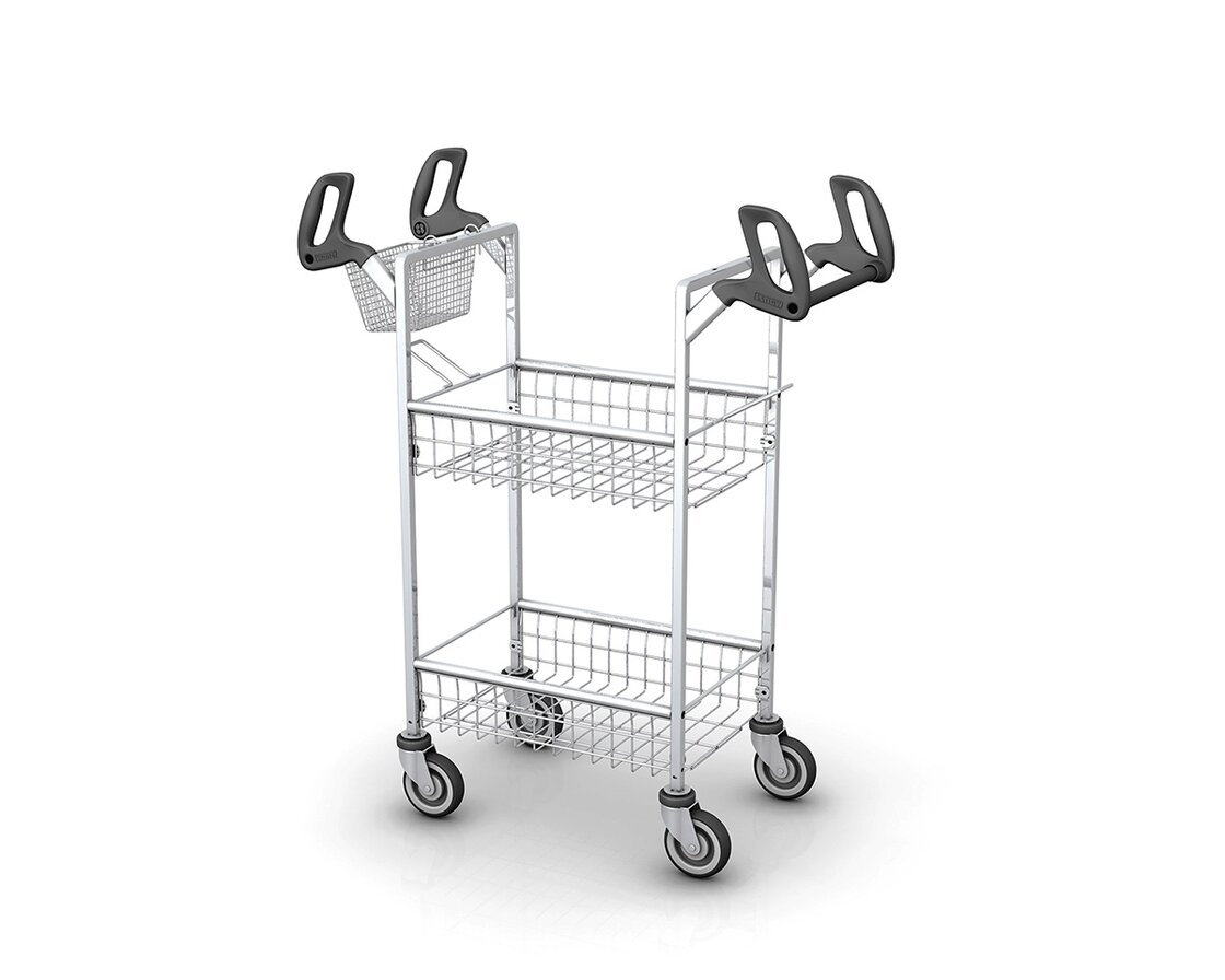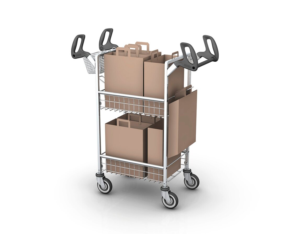 Le chariot pour préparation de commandes KT-G est tout spécialement conçu pour répondre aux besoins du commerce alimentaire en ligne et se distingue par ses dimensions compactes et sa maniabilité. Le chariot est parfaitement adapté pour les préparations des commandes avec des sacs en papier. Équipé de deux crochets métalliques robustes bien pratiques, le KT-G permet d’accrocher des sacs vides. Une fois remplis, les sacs prennent facilement place dans l’un des deux paniers.