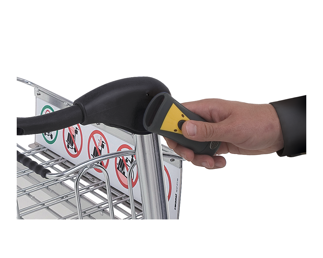 Identification du chariot à bagages au moyen d’un transpondeur intégré dans la poignée.